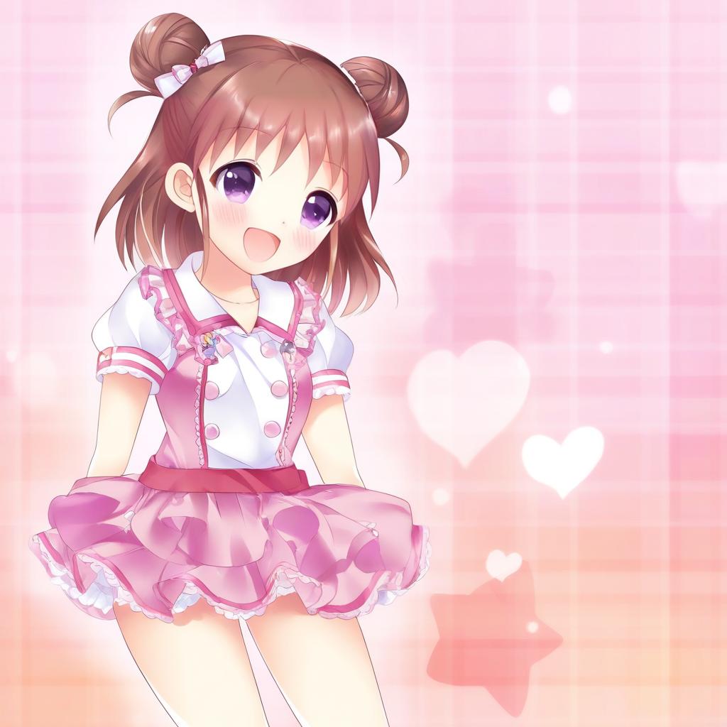 Munakata atsumi, idolmaster, 1girl, purple eyes, brown hair, short hair, double bun, by artist sorai shin'ya, leet