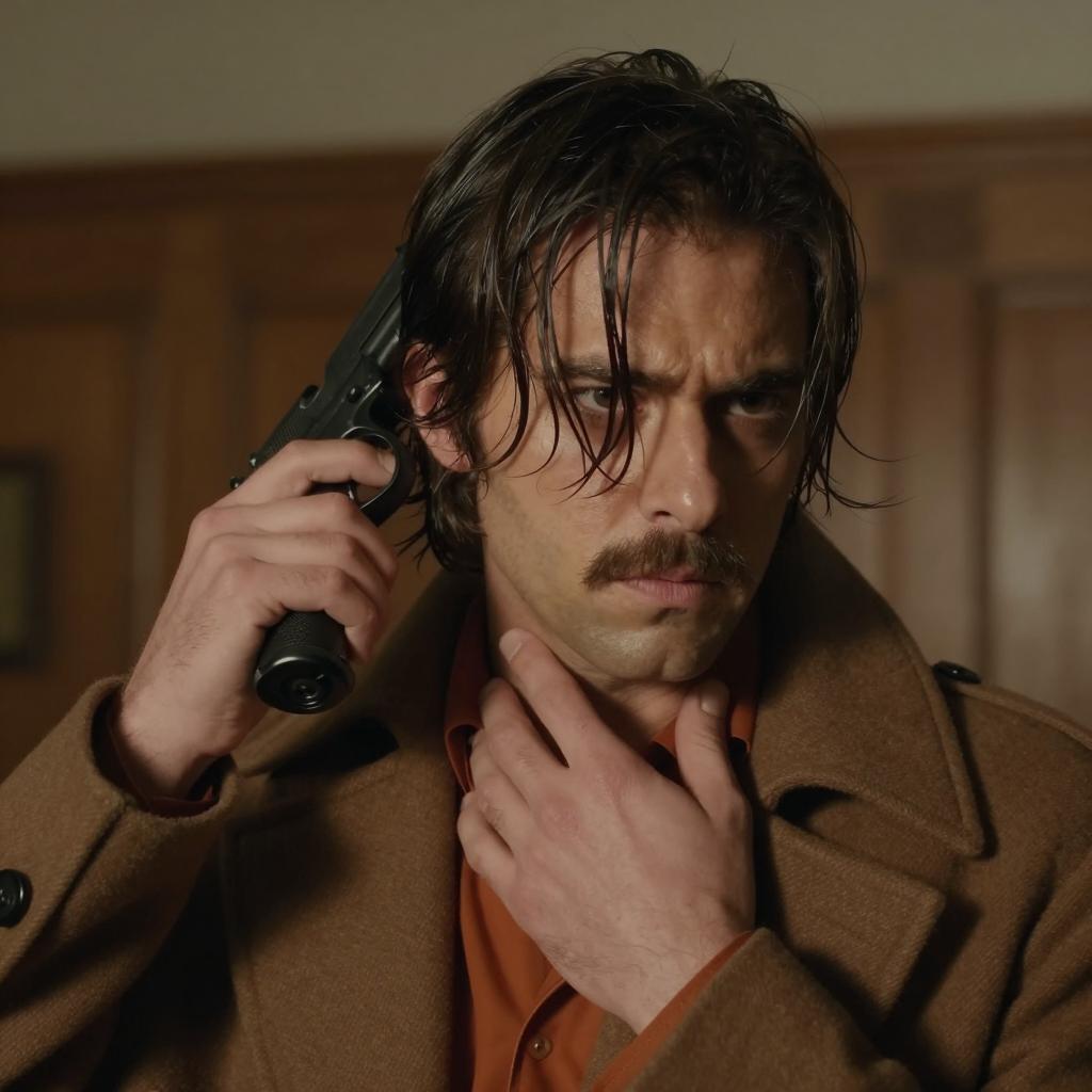 Mid-shot of a man with dark, wet hair and black sunglasses. His bloody hand covers his mouth, with blood on his fingers and face. He wears a shiny, leather jacket. Background has a dimly lit room with framed pictures.