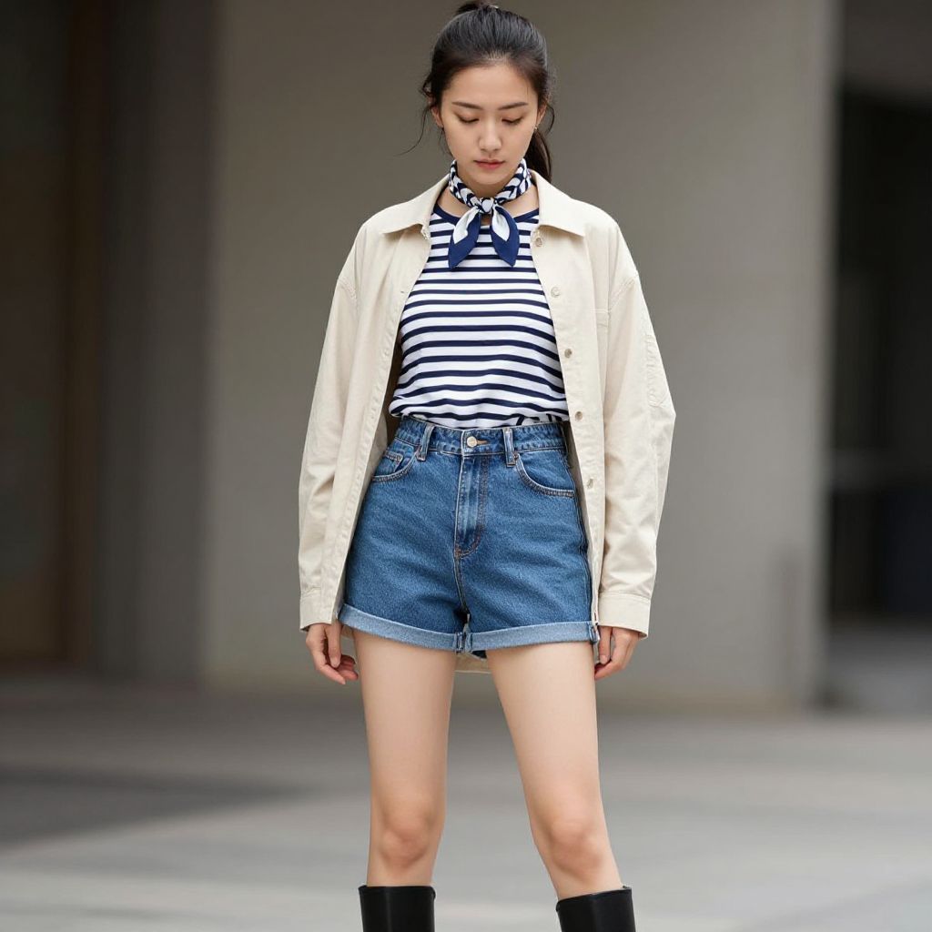 Female model wearing a striped shirt, blue denim shorts, and a beige jacket with a scarf around her neck. She is wearing black boots and has her hair pulled back in a ponytail.
