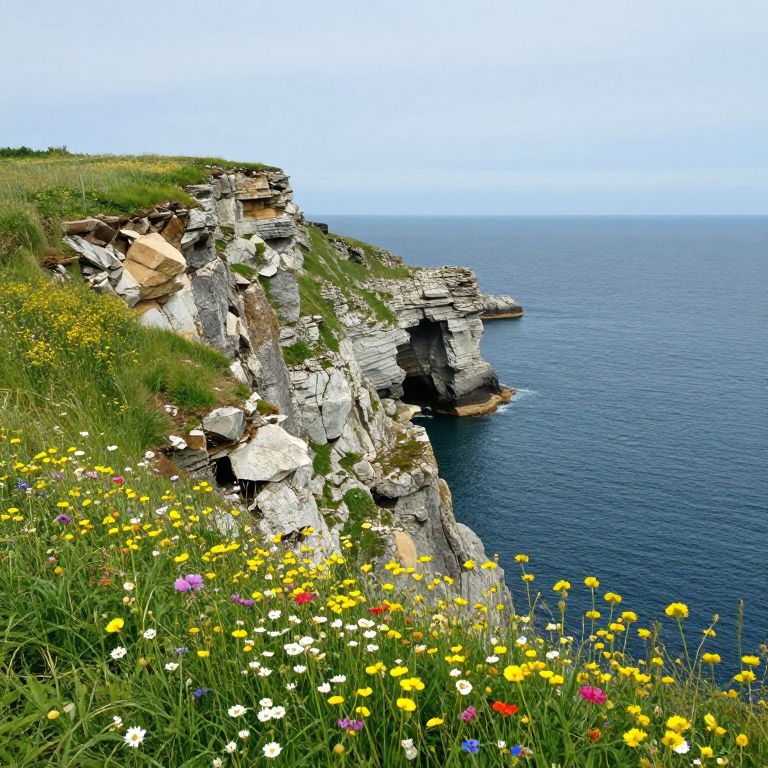 Where earth meets sea, a vibrant tapestry of wildflowers blooms atop ancient cliffs, embodying the eternal dance between fragility and resilience, serenity, and the boundless call of freedom.