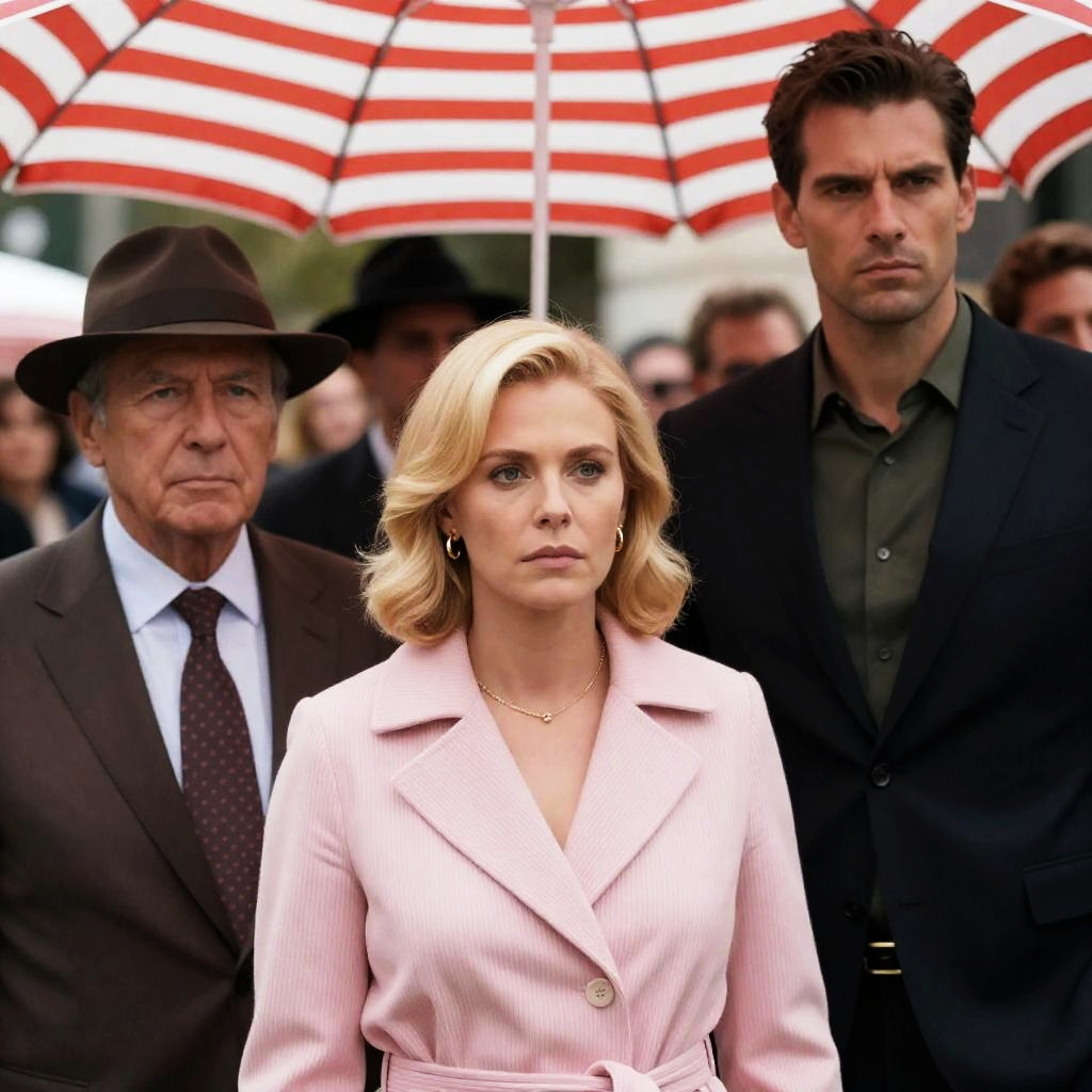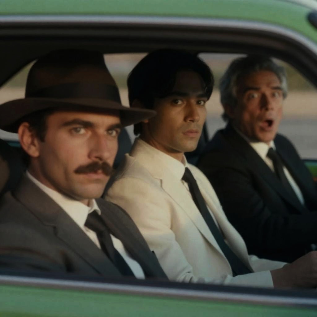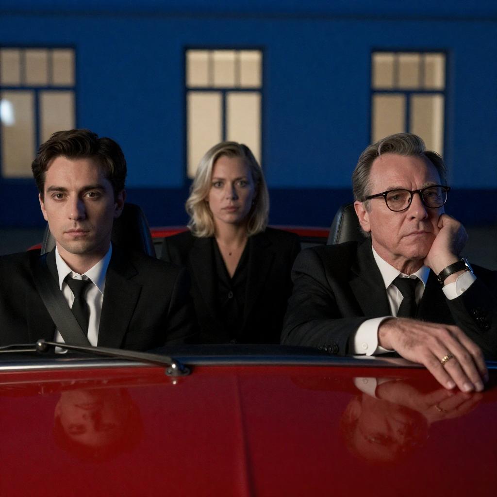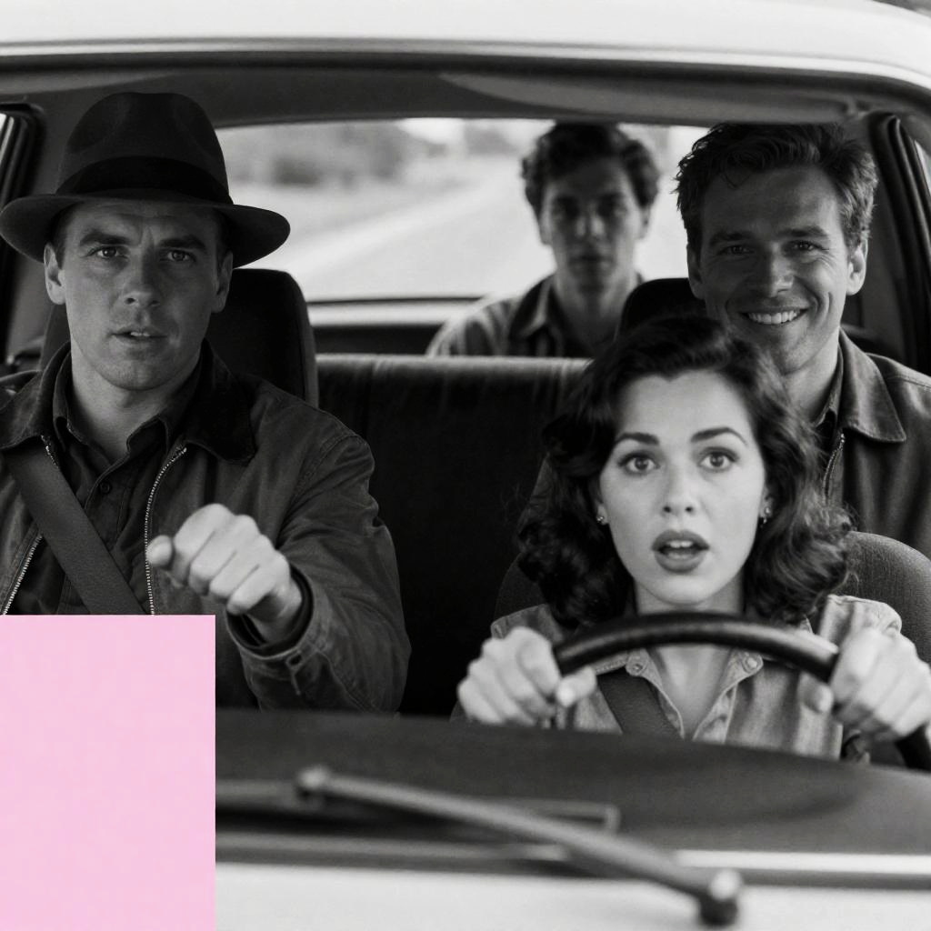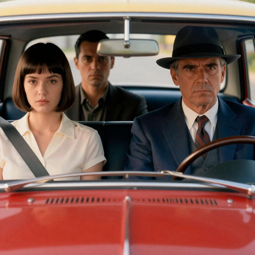 Movie poster. Three people in a car. Driver, middle-aged man in blue suit and hat, serious expression. Passenger, young woman, short bob hairstyle, neutral expression. Passenger in back, man with slicked-back hair, focused expression. Classic car interior. Bold red and yellow at bottom.