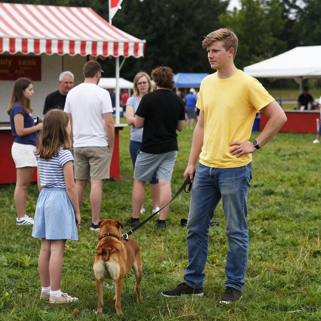 Photograph of a fair scene. Young man in yellow t-shirt and blue jeans stands with hand on hip, brown dog on leash sits at his feet. Group of people in casual clothes, including children, stand and chat nearby. Red and white striped food stall in background. Green grass, trees in distance. Children wear denim skirts and striped shirts. Casual, relaxed atmosphere.