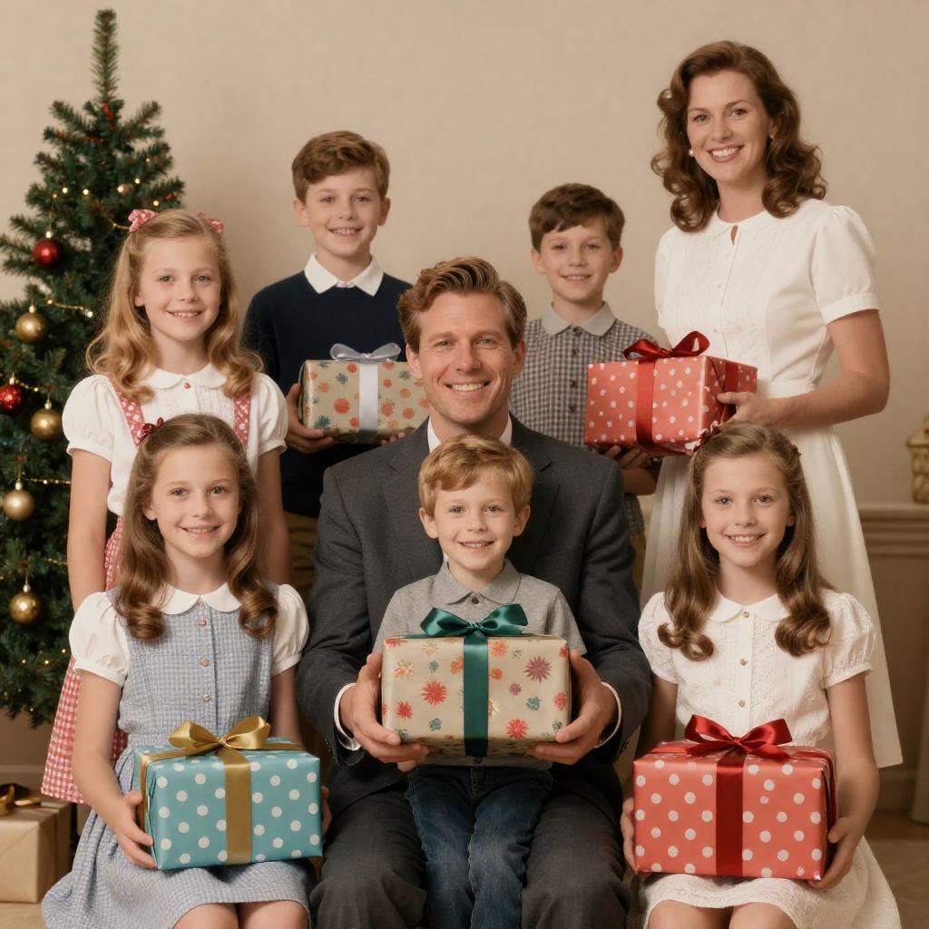 Photograph of a family group. Six people, five children, one man. Man in dark suit, children in dresses, one boy in gray. Man smiling, holding gift. Children smiling, holding gifts. Woman in white dress, smiling, holding gift. Background beige wall, small Christmas tree. Children's hair styled in 1960s fashion. Gifts wrapped in colorful paper. Group arranged in semi-circle, man center, children and woman around. Warm, festive atmosphere.