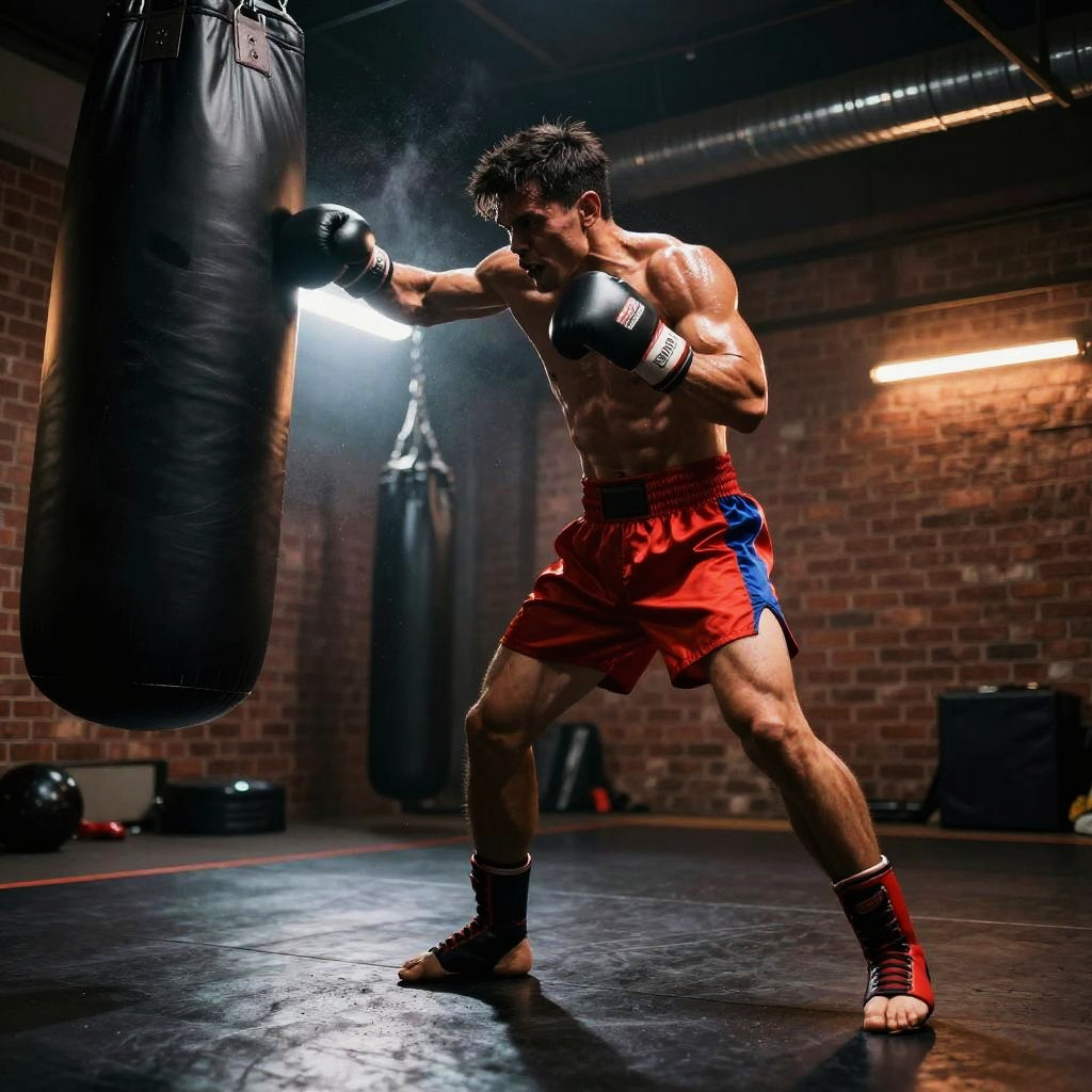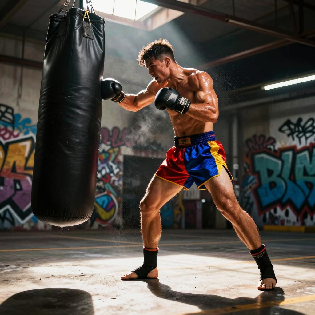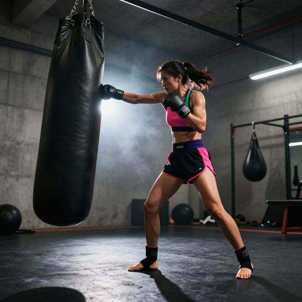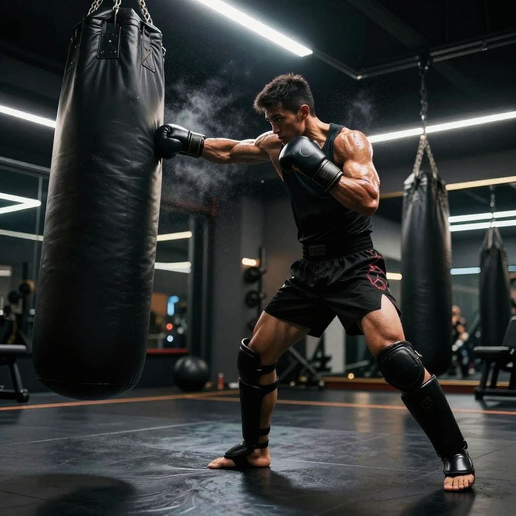 Male mixed martial artist punching a heavy bag in sleek high-tech training facility, futuristic training gear, powerful arms, intense and focused, sweat mist and chalk dust, dynamic low angle perspective, dramatic rim light, volumetric beams, high contrast, ultra-detailed textures, gritty atmosphere, motion blur trails, defined deltoids, reflective floor scuffs, background bokeh, cinematic composition, gritty photorealism, ambient neon glow with deep shadows