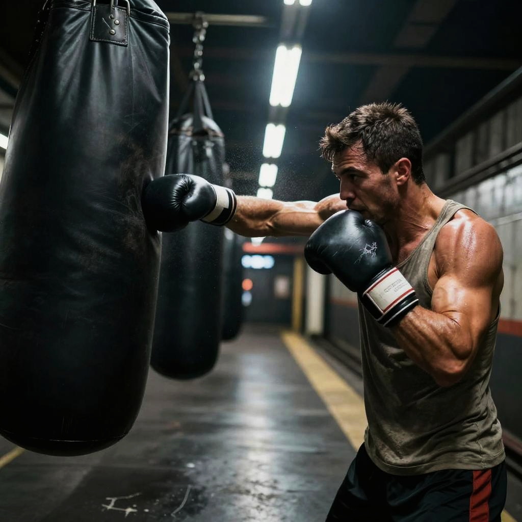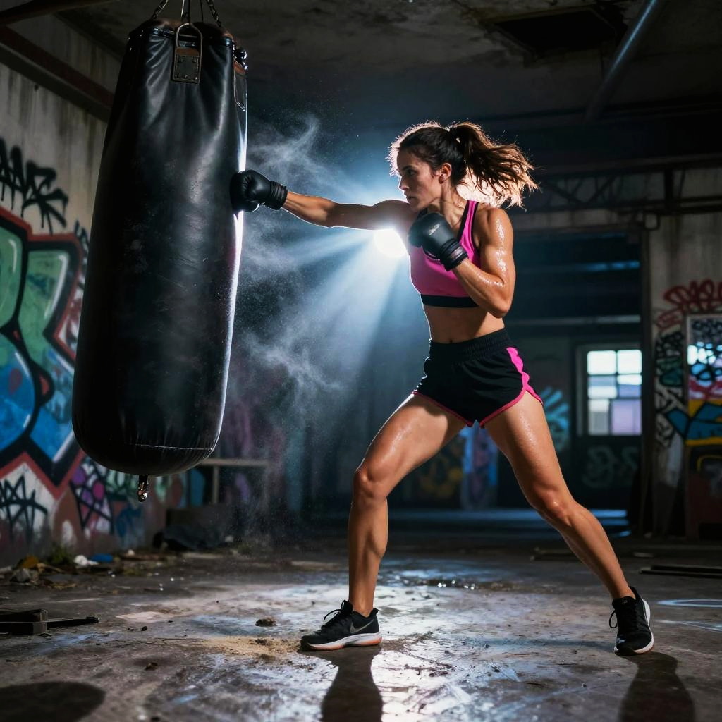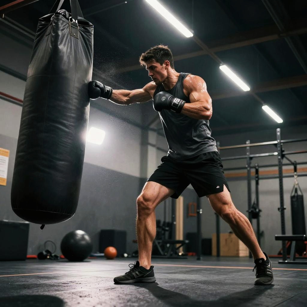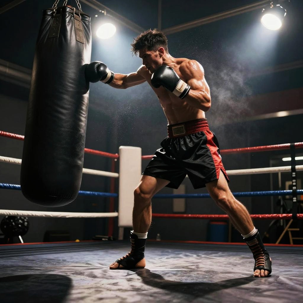Male mixed martial artist punching a heavy bag in sleek high-tech training facility, futuristic training gear, powerful arms, intense and focused, sweat mist and chalk dust, dynamic low angle perspective, dramatic rim light, volumetric beams, high contrast, ultra-detailed textures, gritty atmosphere, motion blur trails, defined deltoids, reflective floor scuffs, background bokeh, cinematic composition, gritty photorealism, ambient neon glow with deep shadows