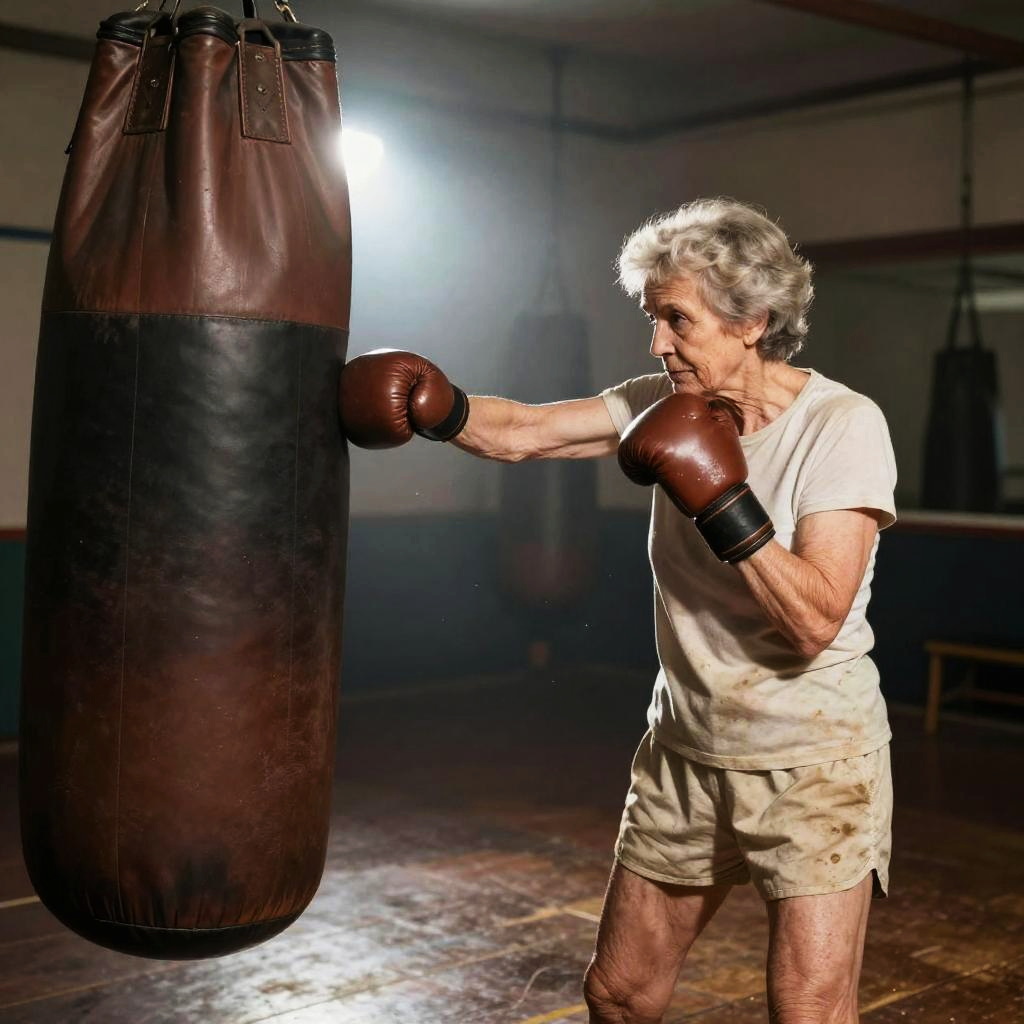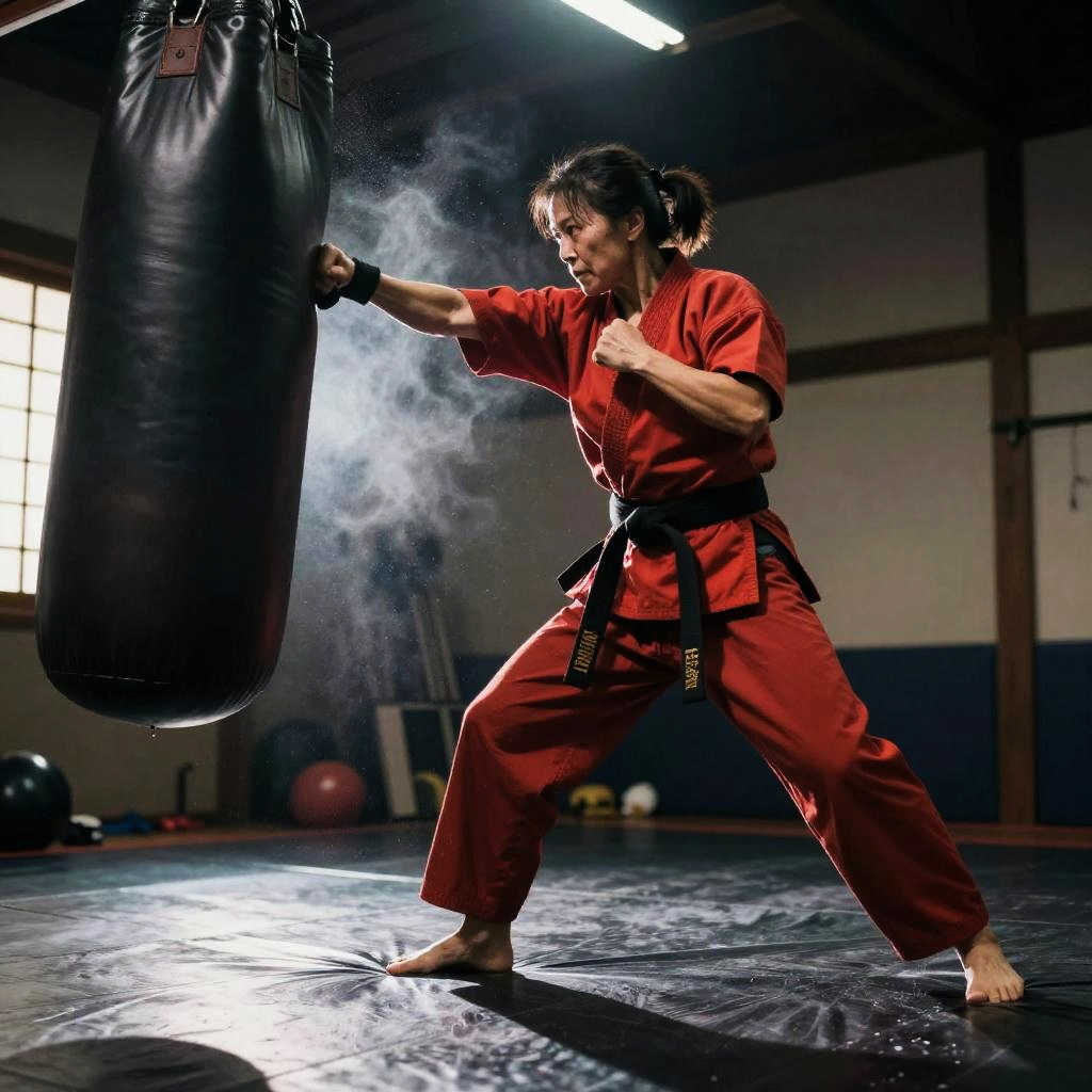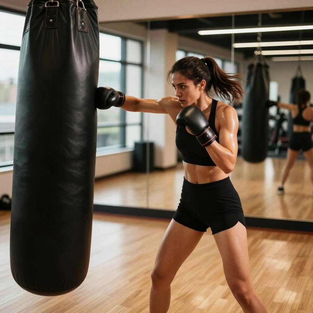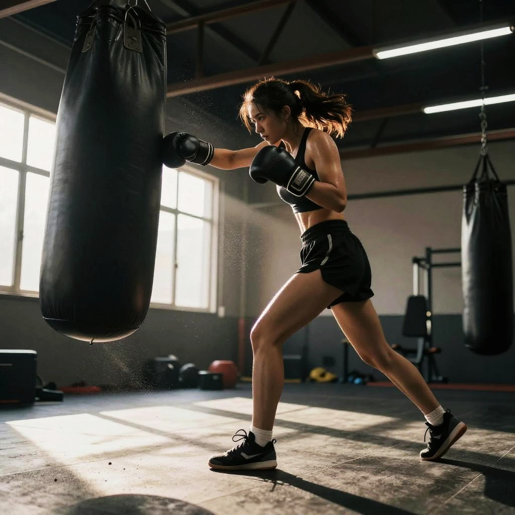 Male mixed martial artist punching a heavy bag in sleek high-tech training facility, futuristic training gear, powerful arms, intense and focused, sweat mist and chalk dust, dynamic low angle perspective, dramatic rim light, volumetric beams, high contrast, ultra-detailed textures, gritty atmosphere, motion blur trails, defined deltoids, reflective floor scuffs, background bokeh, cinematic composition, gritty photorealism, ambient neon glow with deep shadows