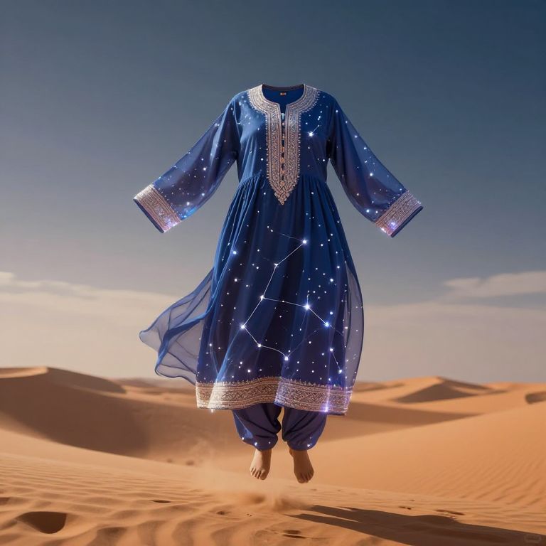 AI prompt shalwar kameez: A surreal, AI-generated scene of a shalwar kameez floating above a desert landscape, with glowing threads forming constellations, blending spirituality, fashion, and digital art in a dreamy, otherworldly atmosphere.