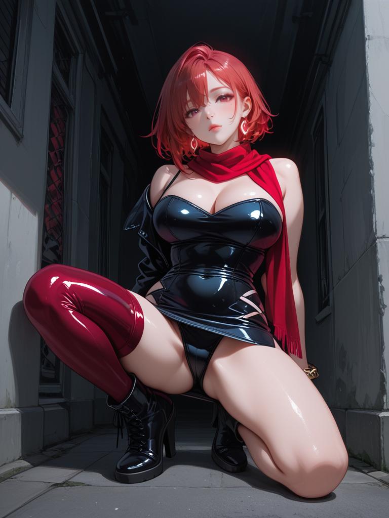1girl, realistic face, Bodycon mini dress, bold red, smooth satin, asymmetrical hem, cut-out sides, sheer organza scarf, cascading down one shoulder, statement earrings, ankle boots, edgy vibe.