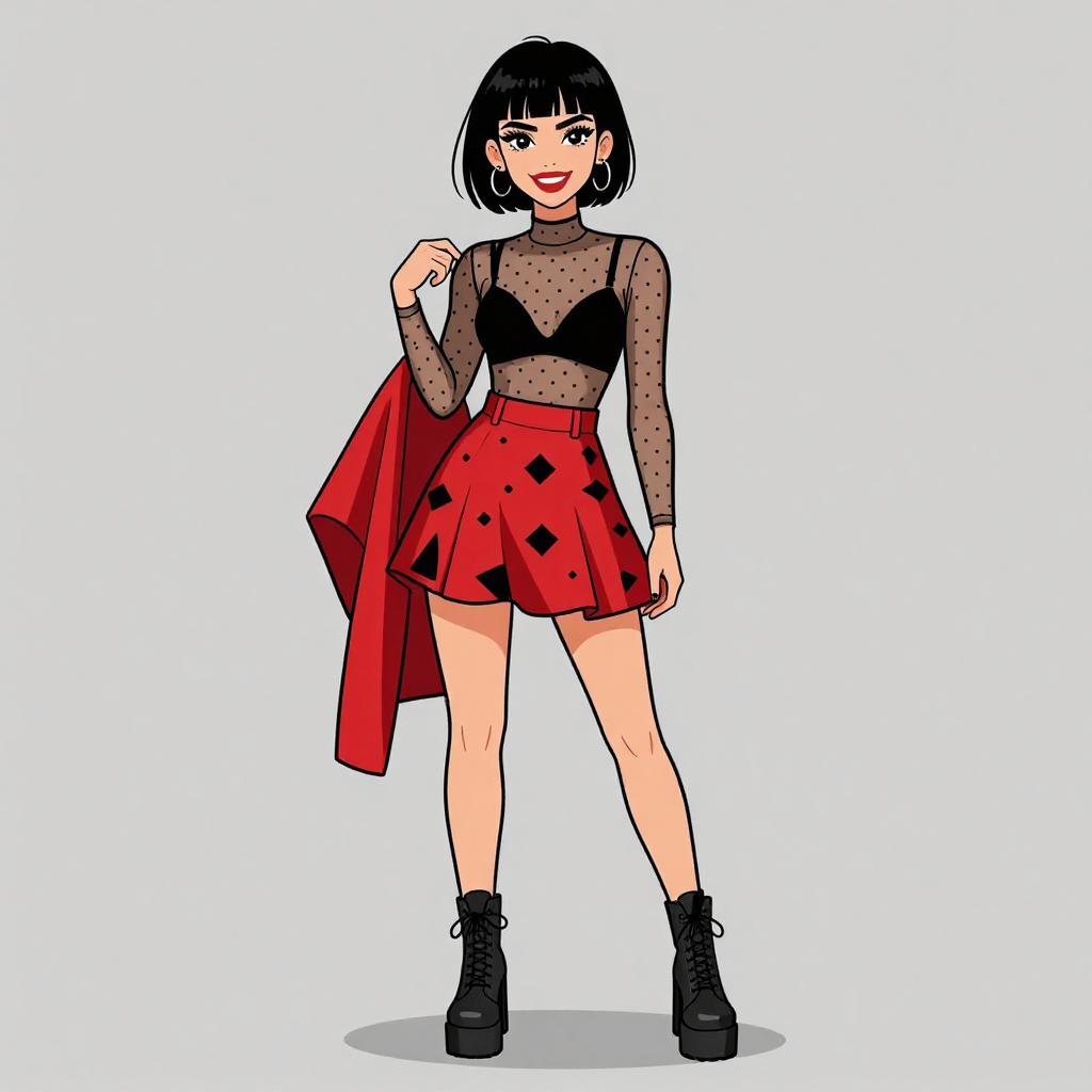 Digital illustration of a stylish young woman with a bob haircut and fair skin. She wears a sheer black long-sleeve top with a black bra visible underneath, paired with a high-waisted, red, diamond-patterned skirt that flares out. She holds a red coat over her left shoulder and stands confidently in black platform boots. Her makeup includes bold red lipstick, and she has a playful, slightly mischievous expression. The background is plain white, emphasizing her vibrant outfit and confident pose. The artwork is in a modern, colorful, and slightly cartoonish style.
