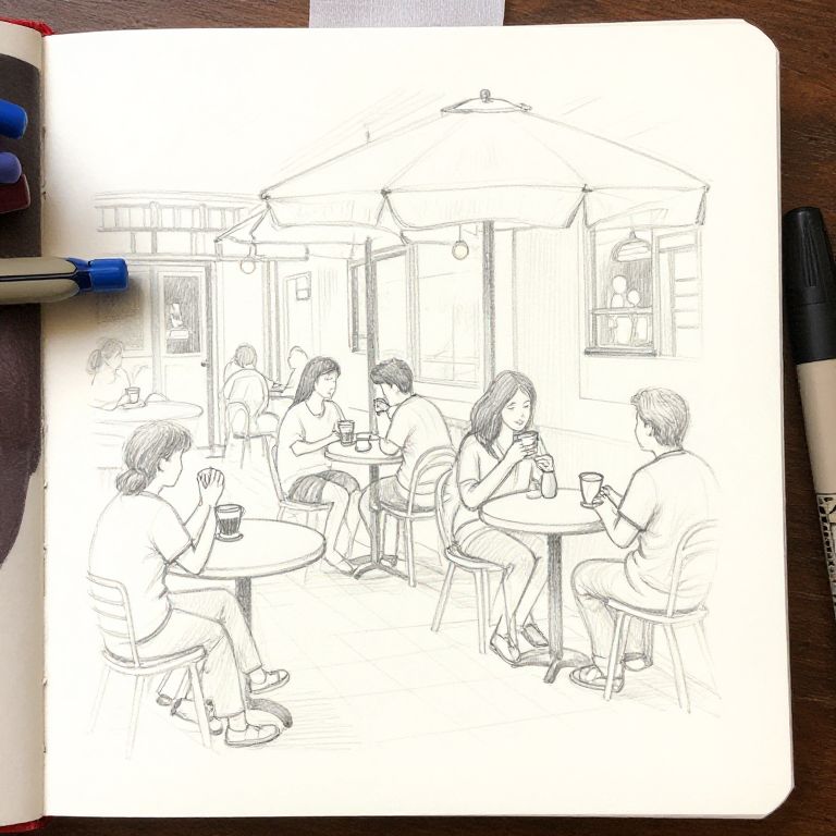 Black-and-white sketch of five people sitting at outdoor café tables, drinking cups, under umbrellas, with detailed background buildings. Pencils and sketch