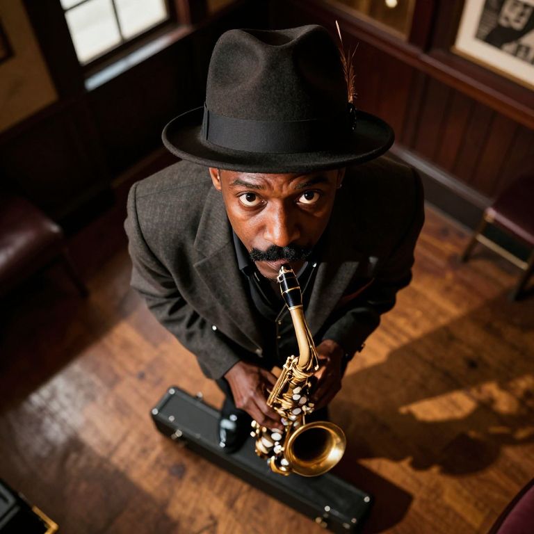 Imagine a photorealistic portrait of an African American jazz musician, his soulful eyes captivating and a luxurious mustache adorning his face. Wearing a stylish fedora with a feather, he stands out while his signature saxophone case lies at his feet. The scene is captured from an inverted perspective, as if viewed through a mirror above him, intensifying the subject's gaze. Ambient light filters in from high windows, casting long shadows across the warm wooden floor of the dimly lit speakeasy and highlighting the rich textures of his skin and clothing. This interplay between light and shadow evokes nostalgia, longing, and raw emotion.