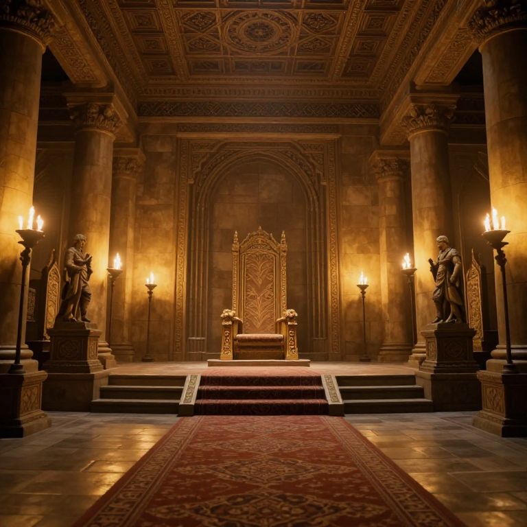 Photograph of a grand, dimly-lit, Gothic-style throne room with warm, amber lighting. A richly decorated, ornate throne with intricate carvings sits on a raised platform at the center, flanked by two tall stone statues. The room features tall, textured columns, a patterned red carpet leading to the throne, and an elaborately adorned ceiling with geometric designs. Four torch-like wall sconces provide additional light. The overall ambiance is majestic and solemn, with a focus on medieval opulence and grandeur.