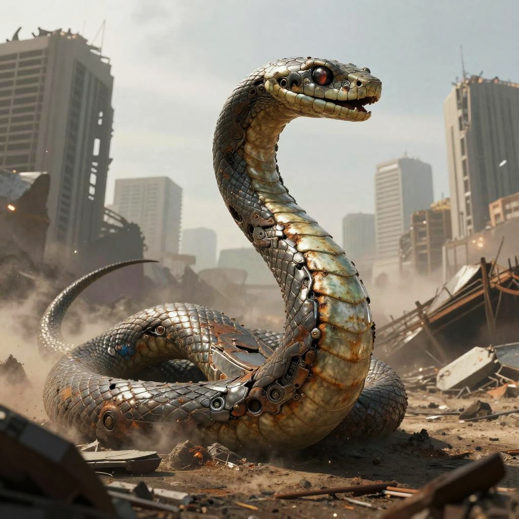 Photorealistic digital artwork depicts a large, metallic-scaled snake with red eyes and a menacing expression, coiled in a rubble-strewn, post-apocalyptic cityscape. The snake's scales are reflective, with a mix of silver and rust hues. Surrounding buildings are partially collapsed, with dust clouds and debris scattered across the ground. The background features tall, damaged skyscrapers under a bright, clear sky, adding to the desolate atmosphere. The snake's detailed texture and the urban ruins create a striking contrast, emphasizing a futuristic, dystopian setting.