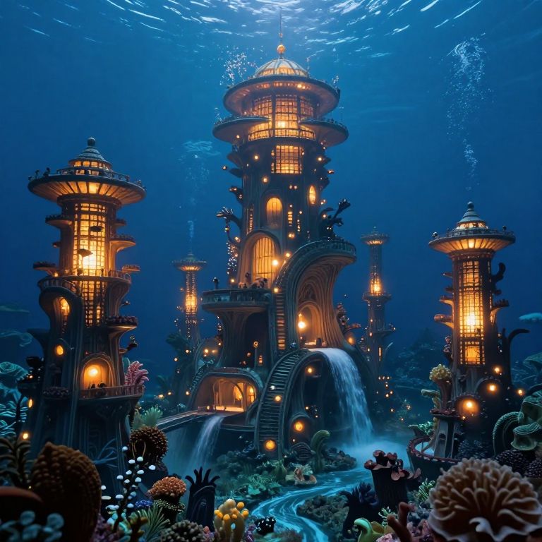 Underwater fantasy cityscape with illuminated, towering lantern-like buildings, cascading waterfalls, vibrant coral reefs, and glowing lights in a deep blue ocean