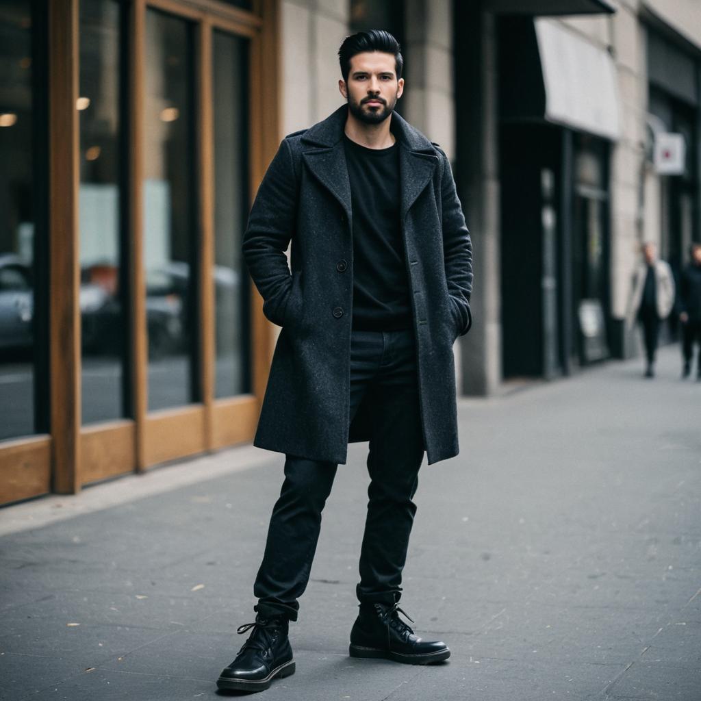 Full body portrait of a fashionable young man with black hair and facial hair, wearing a dark gray long coat, black sweater, black pants, and black boots. He stands confidently on a city sidewalk with hands in pockets, looking directly at the camera. The background shows a blurred urban environment with building windows and pedestrians.