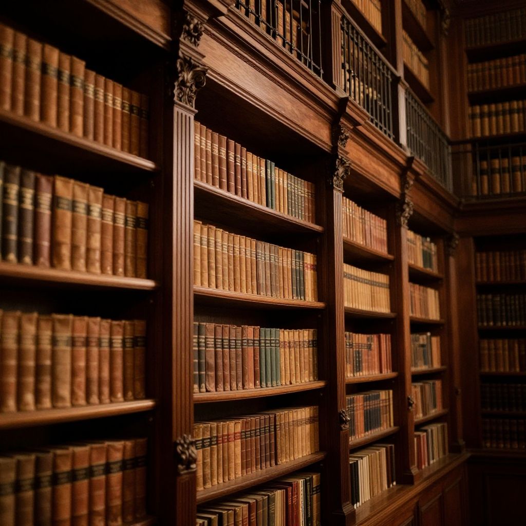 Upscale and sharpen image of an antique library interior, books and wood grain vividly detailed, warm lighting, intricate architectural elements, cinematic realism