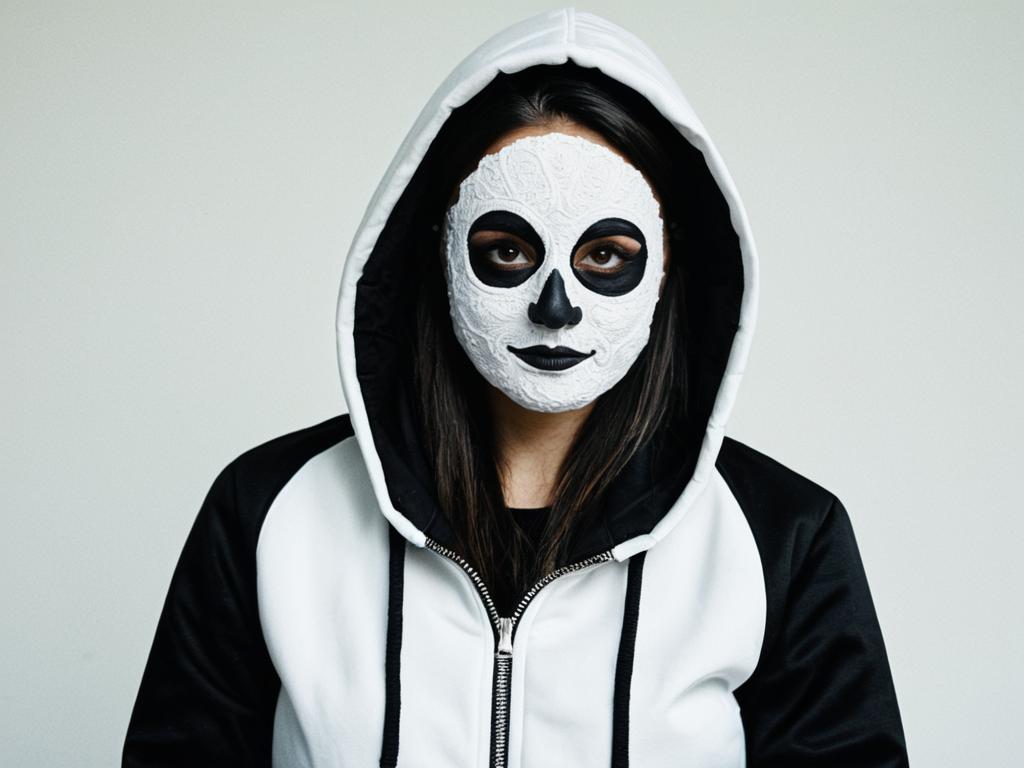 Common Halloween, woman in a black hoodie and skeleton face paint