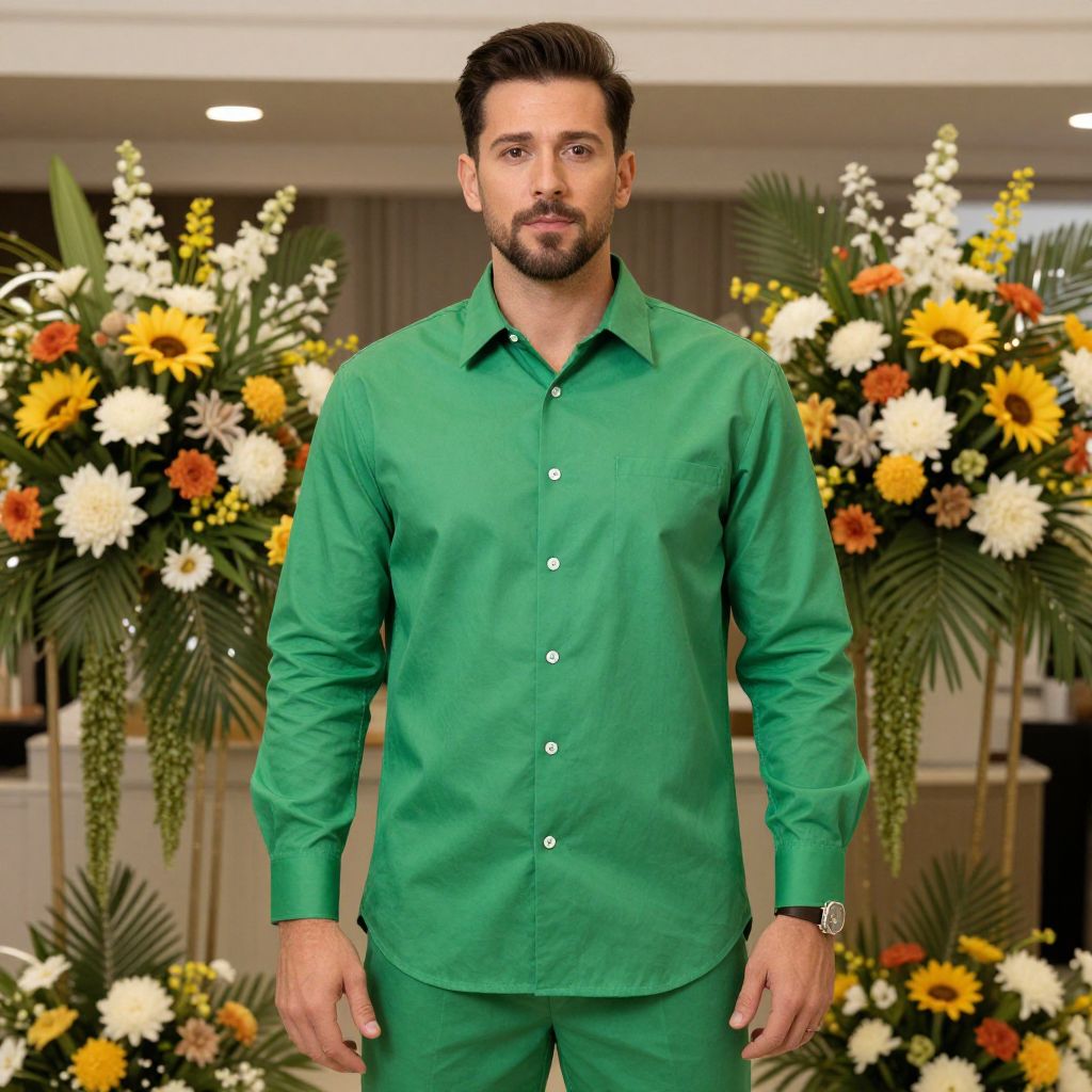 Green Shirt Man Outfit Costume, man in green shirt standing in front of a floral arrangement