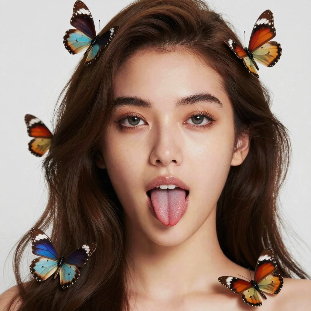 Head and shoulders portrait of a young woman with long brown hair and fair skin, posing with her tongue out. Multiple realistic butterflies with vibrant blue and orange wings are positioned around her head and shoulder. The image is highly detailed with sharp focus and studio lighting on a plain background.