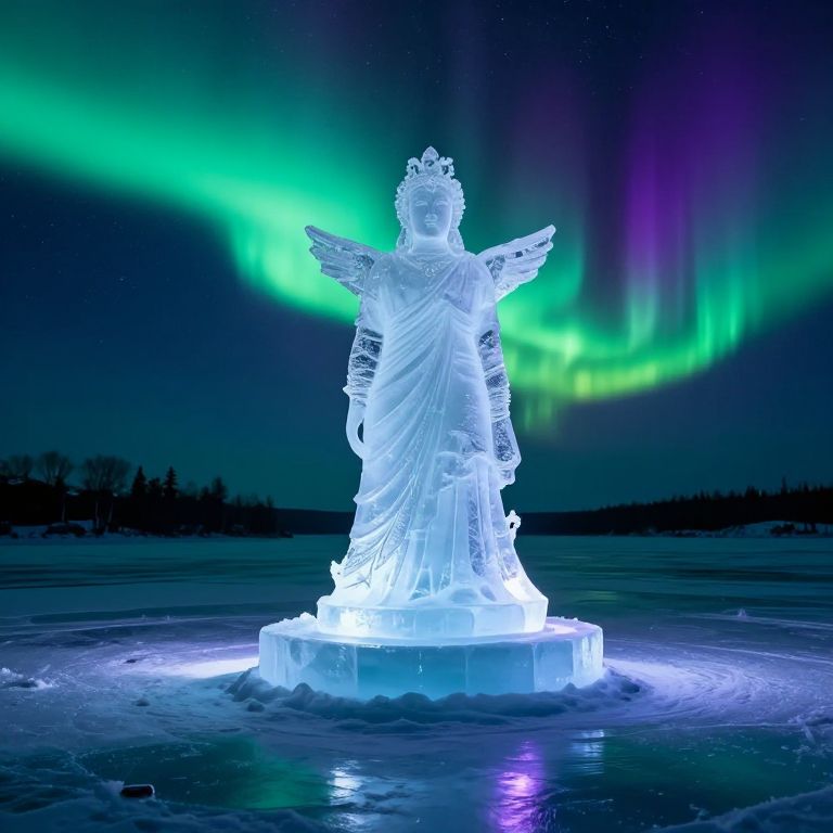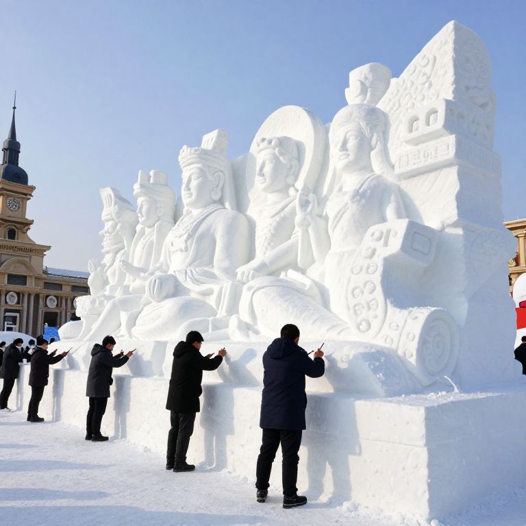 Against the stark winter sky, a colossal snow sculpture of a sunlit visage emerges, symbolizing the eternal dance between light and shadow, while a solitary worker carves with focused intent, embodying the human spirit’s resilience and creative transcendence amidst the cold embrace of winter.