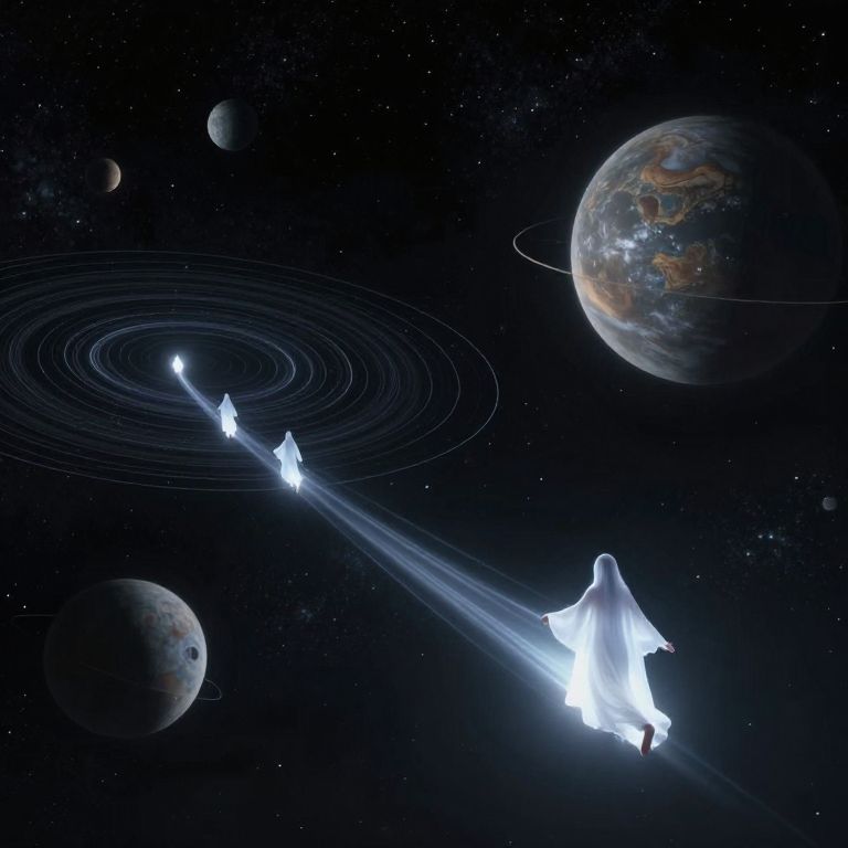 In a surreal expanse where celestial bodies dance in silent orbits, cloaked figures glide on luminous paths, embodying the timeless pursuit of freedom and transcendence amidst the infinite void.