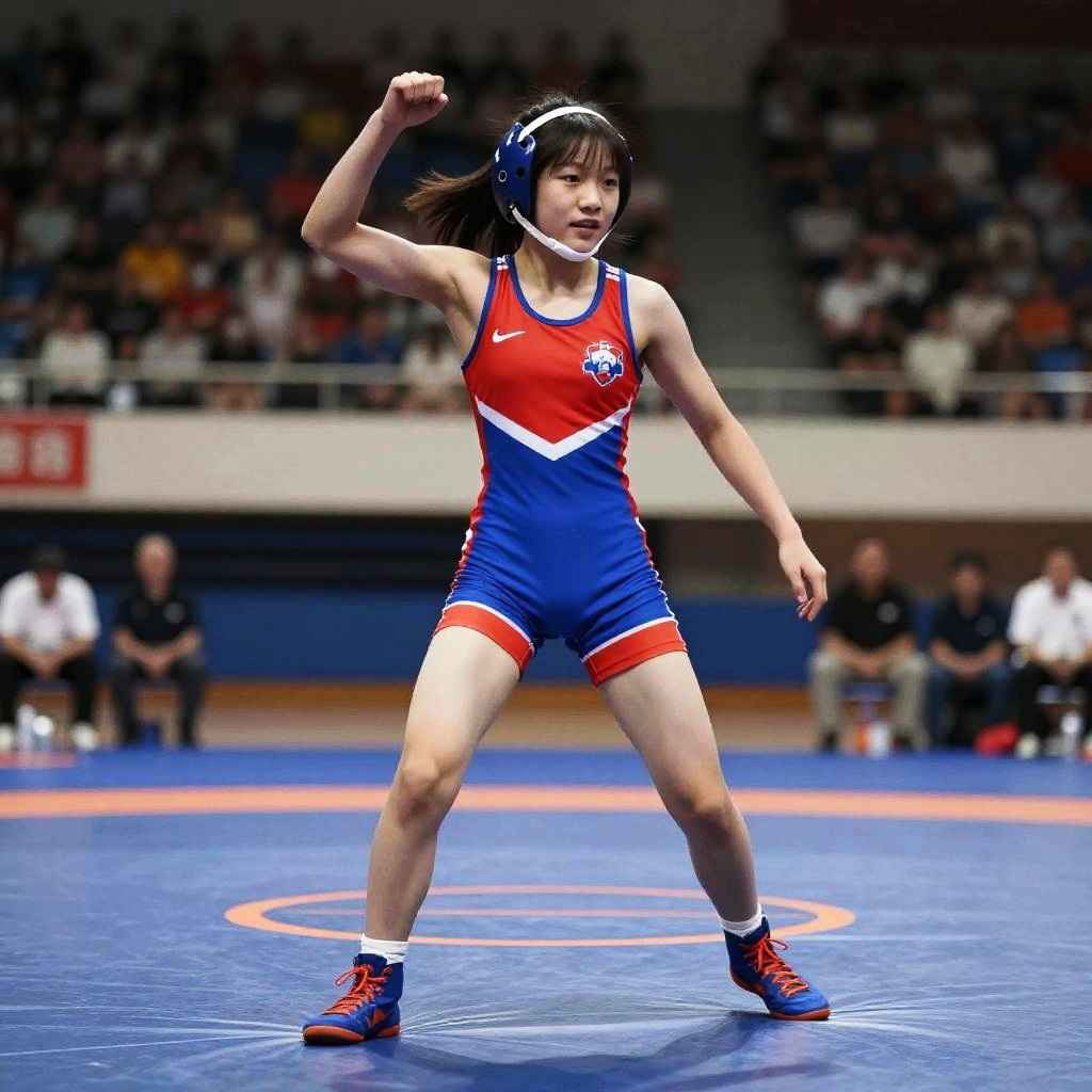 Girls wrestling outfit, dynamic sportswear in action, vibrant colors, tight fit fabric, high energy wrestling match background, realistic style, detailed textures