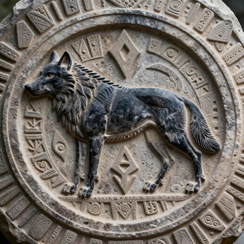 Symbolism of black wolf portrayed as a totem animal on an ancient stone carving surrounded by tribal patterns, highlighting themes of protection, loyalty, and primal instincts, intricate and textured