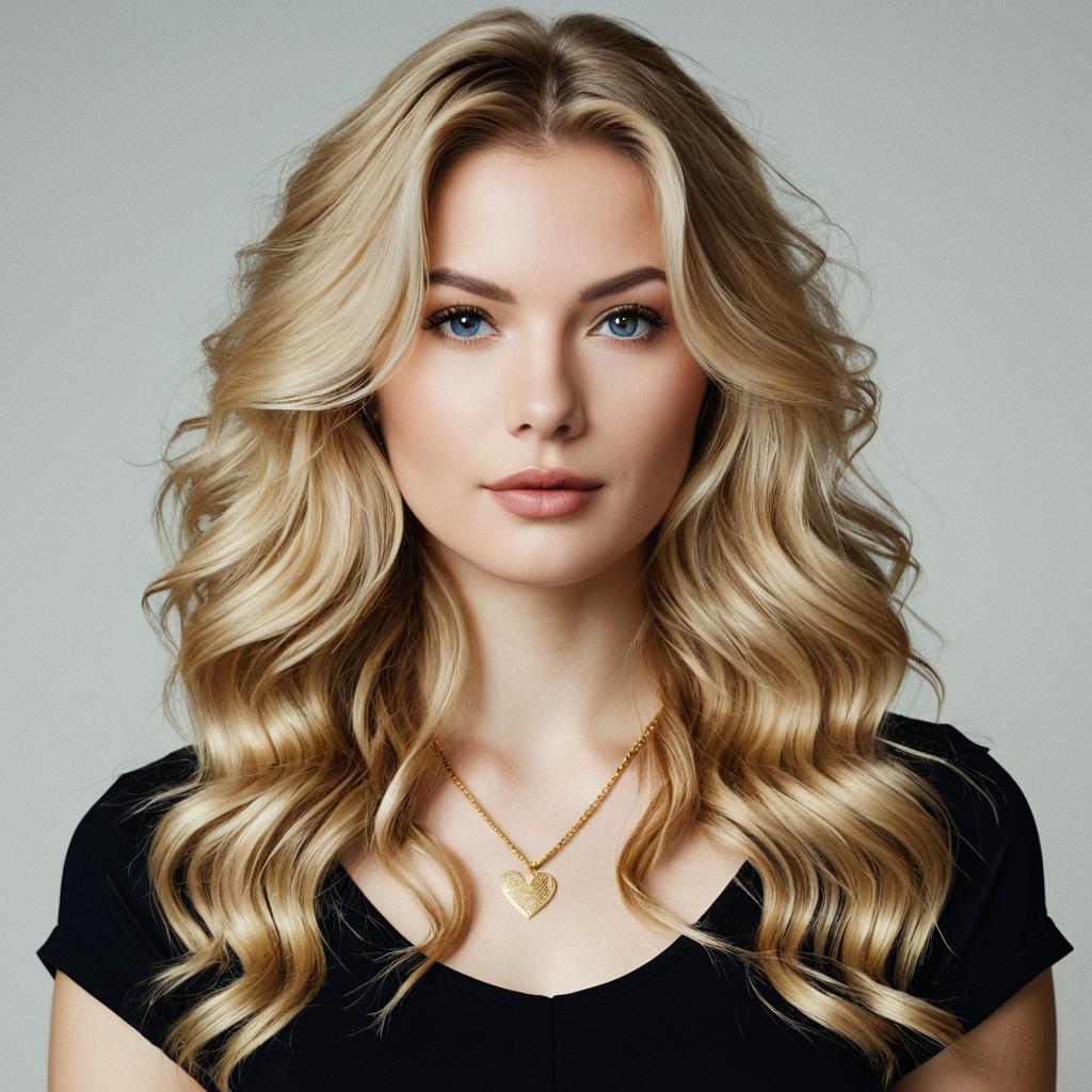 Hair styling supply, digital portrait of a beautiful young woman with long, voluminous, wavy blonde hair, blue eyes, fair skin, wearing a black top and a gold necklace, realistic style, close-up, hyper-detailed hair ure, soft lighting, neutral background, slight three-quarter view, fantasy or high-fashion aesthetic, photorealistic rendering, front-facing, slight expressionless gaze, slight blush on cheeks, detailed hair strands, high-quality rendering.