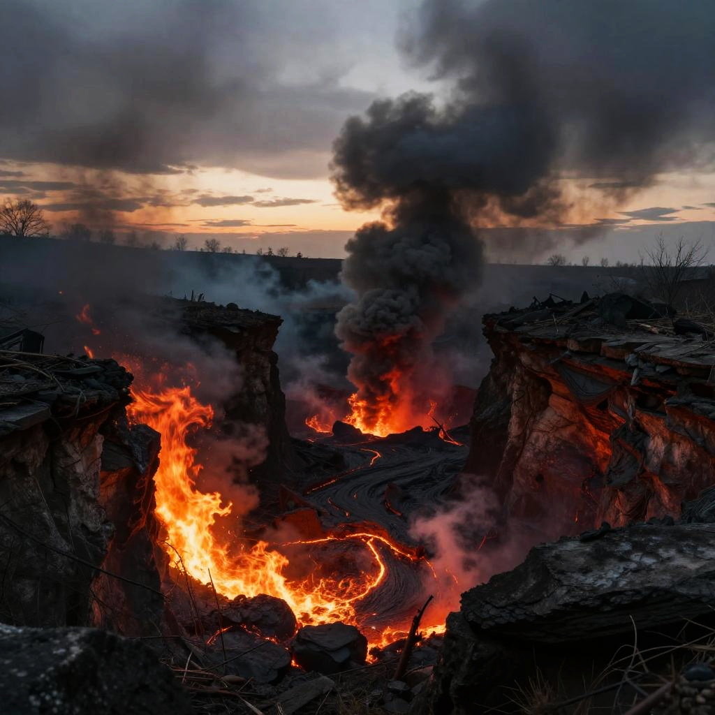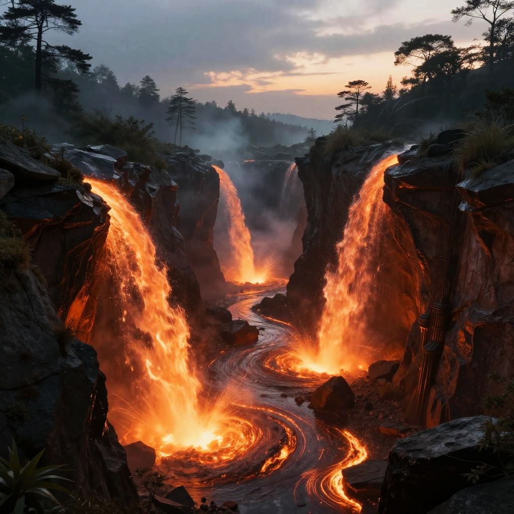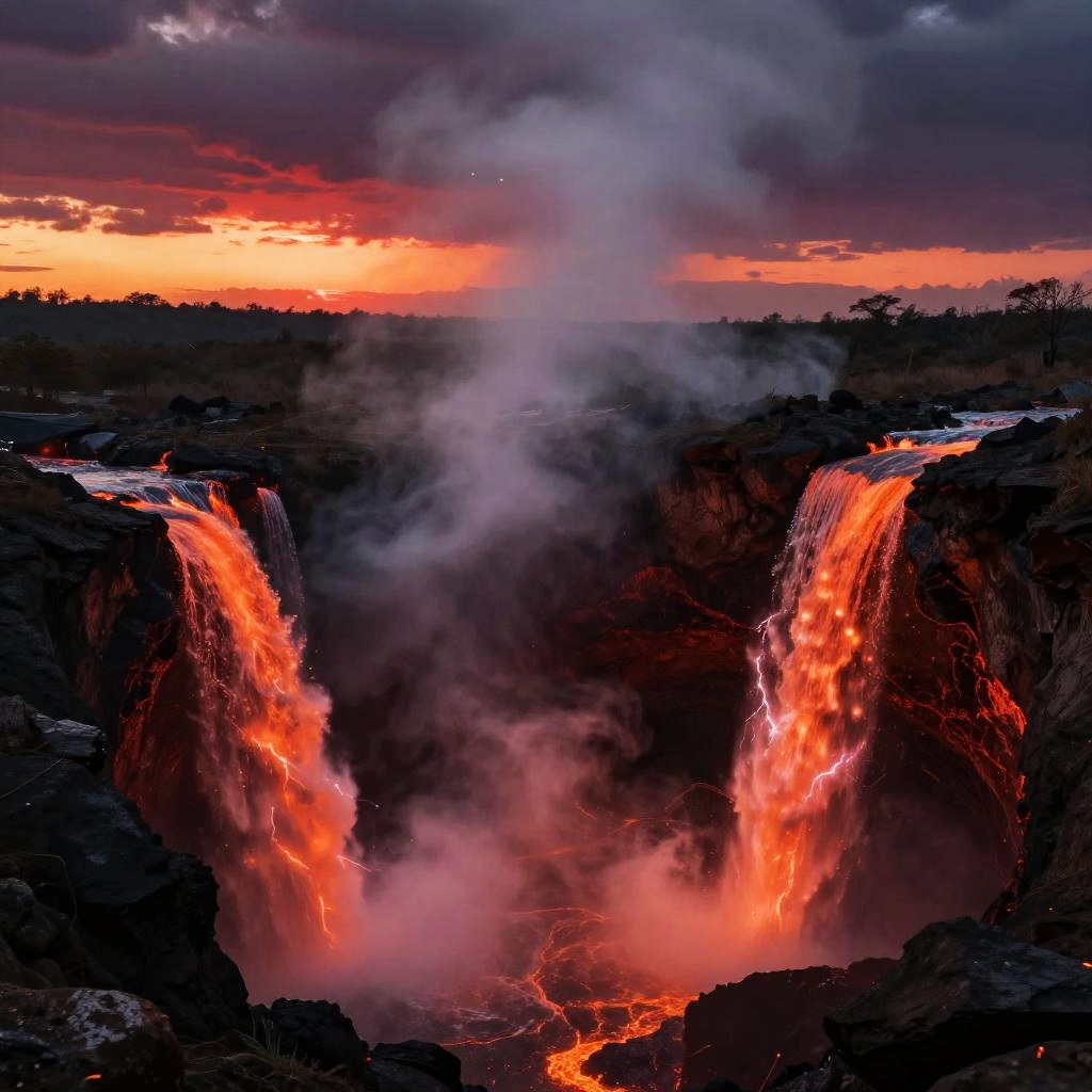 Molten Ravine, glowing magma cascades, electric sparks in dense smoke, sunset with blood red hues, Surrealism – dreamlike and intense