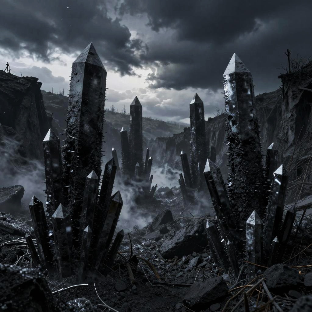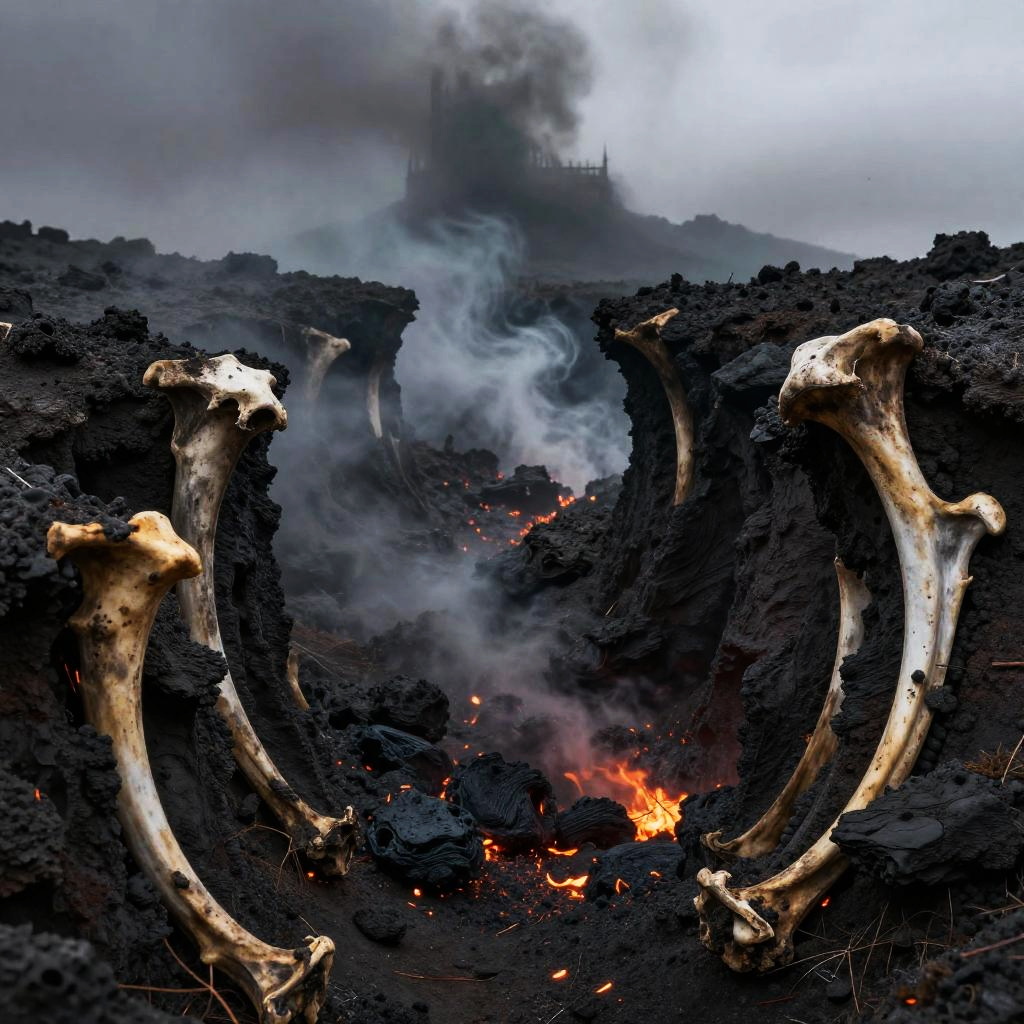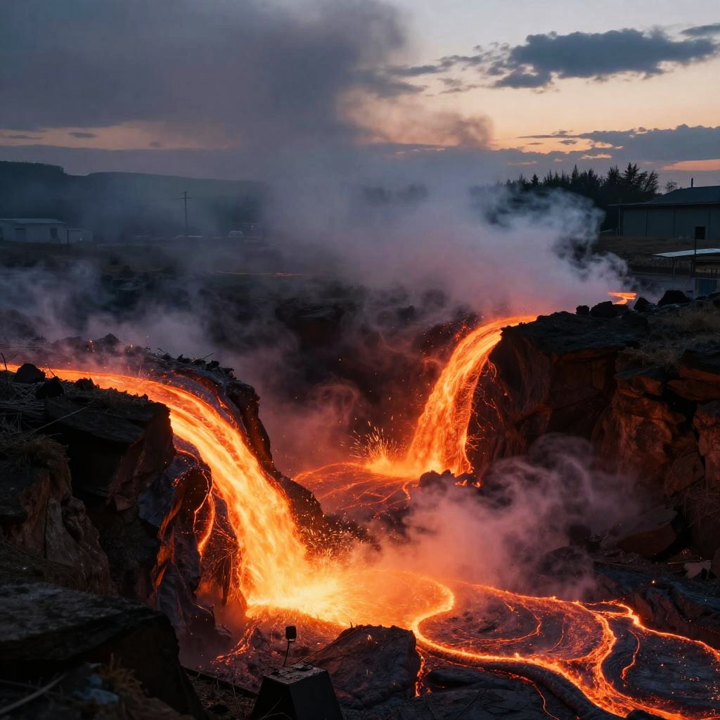 Molten Ravine, glowing magma cascades, electric sparks in dense smoke, sunset with blood red hues, Surrealism – dreamlike and intense