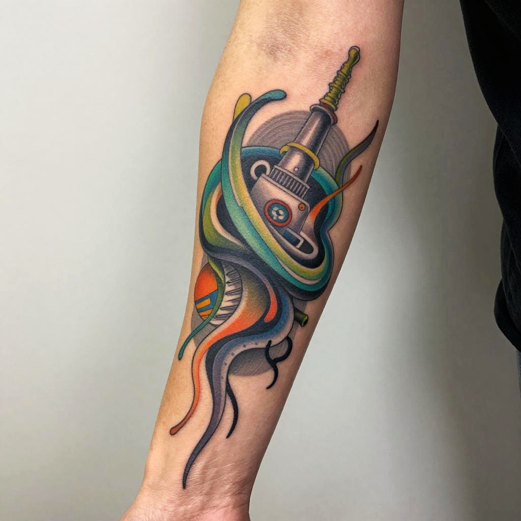 Sleeve tattoo pictures capturing surreal abstract designs with flowing lines and vivid colors, blending organic and mechanical elements, high contrast, photorealistic style, tattoo art on forearm, studio quality, creative body art imagery.