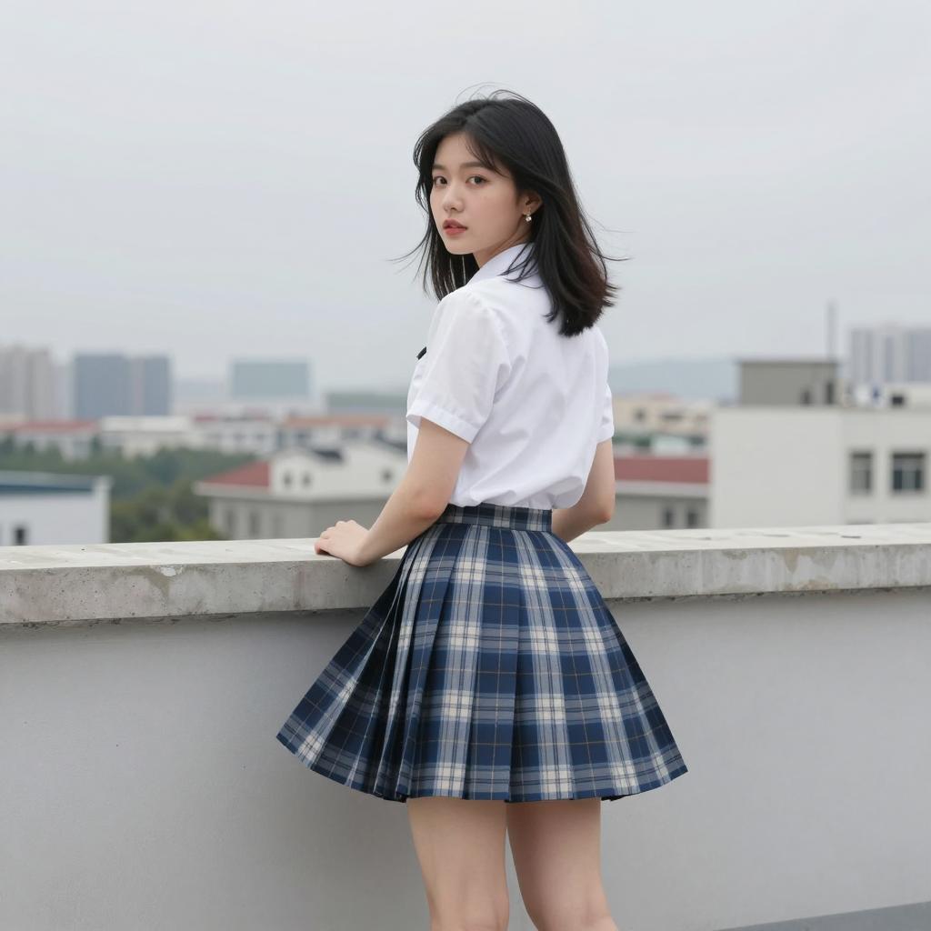 Asian woman in a school uniform with white shirt, navy blue pleated skirt, and black bag. Long black hair, bangs, red lipstick. Standing on stairs, looking back over shoulder, hand on railing. Stairs with metal railings, glass ceiling. Natural light. Realistic photograph.