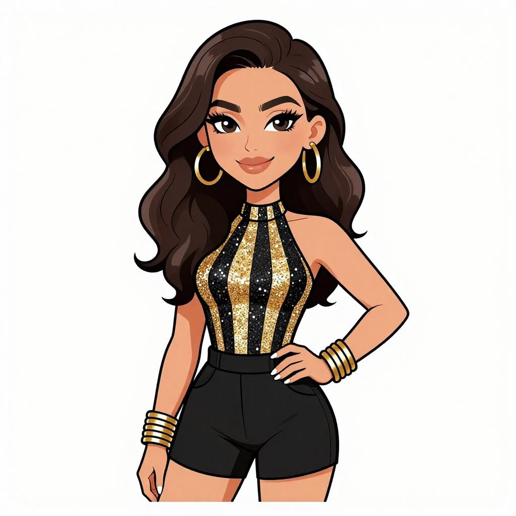 Woman with pretty face and pretty hair. smiling Woman, glam, sequin-embellished sleeveless top with high neckline, black and gold stripes, fitted black shorts, multiple metallic bangles on one wrist. --sref 1467