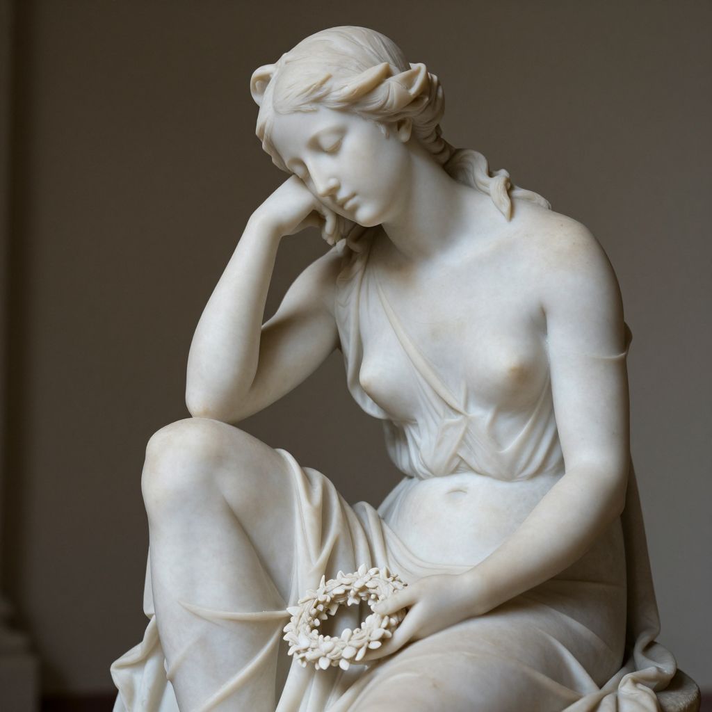 A classical marble sculpture depicts a contemplative woman seated gracefully, her head resting on her right hand as she holds a delicate wreath in her left, rendered in high-definition detail with soft, natural lighting that enhances its timeless elegance.