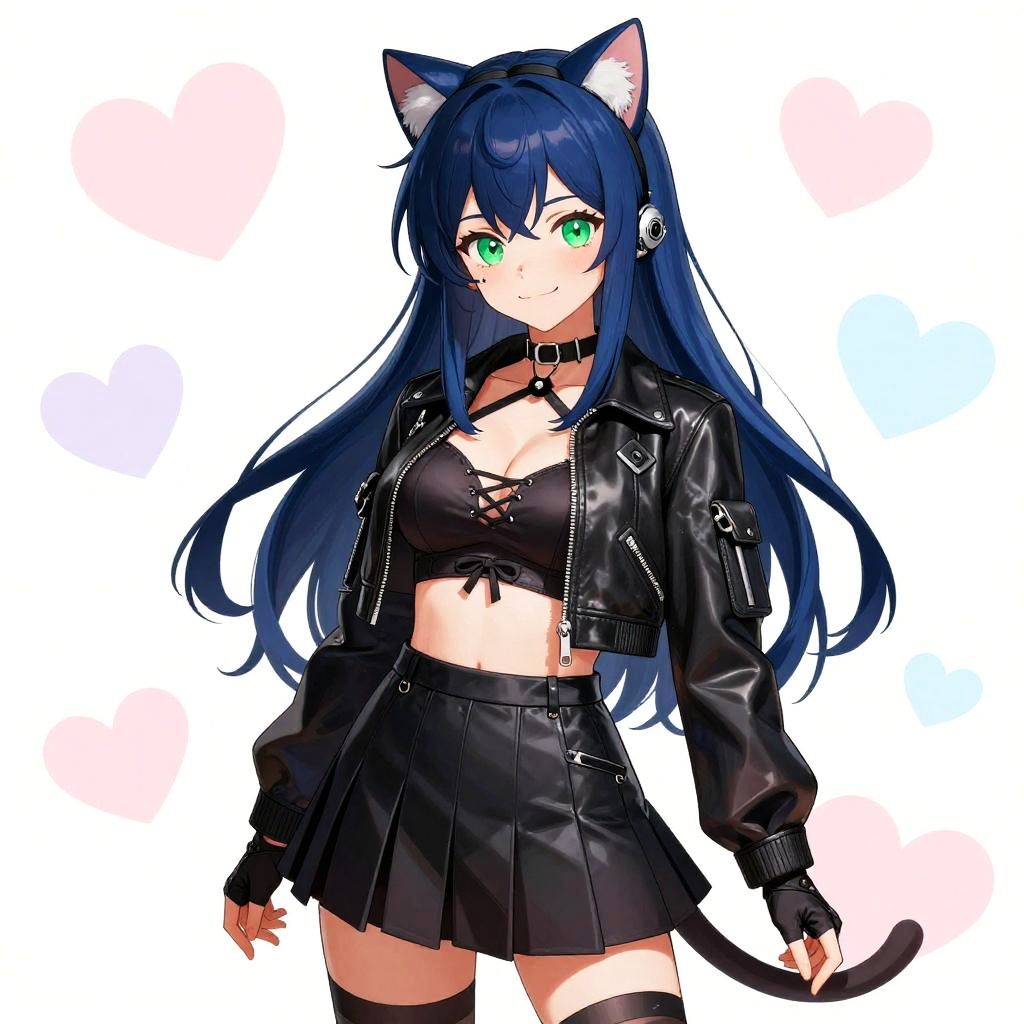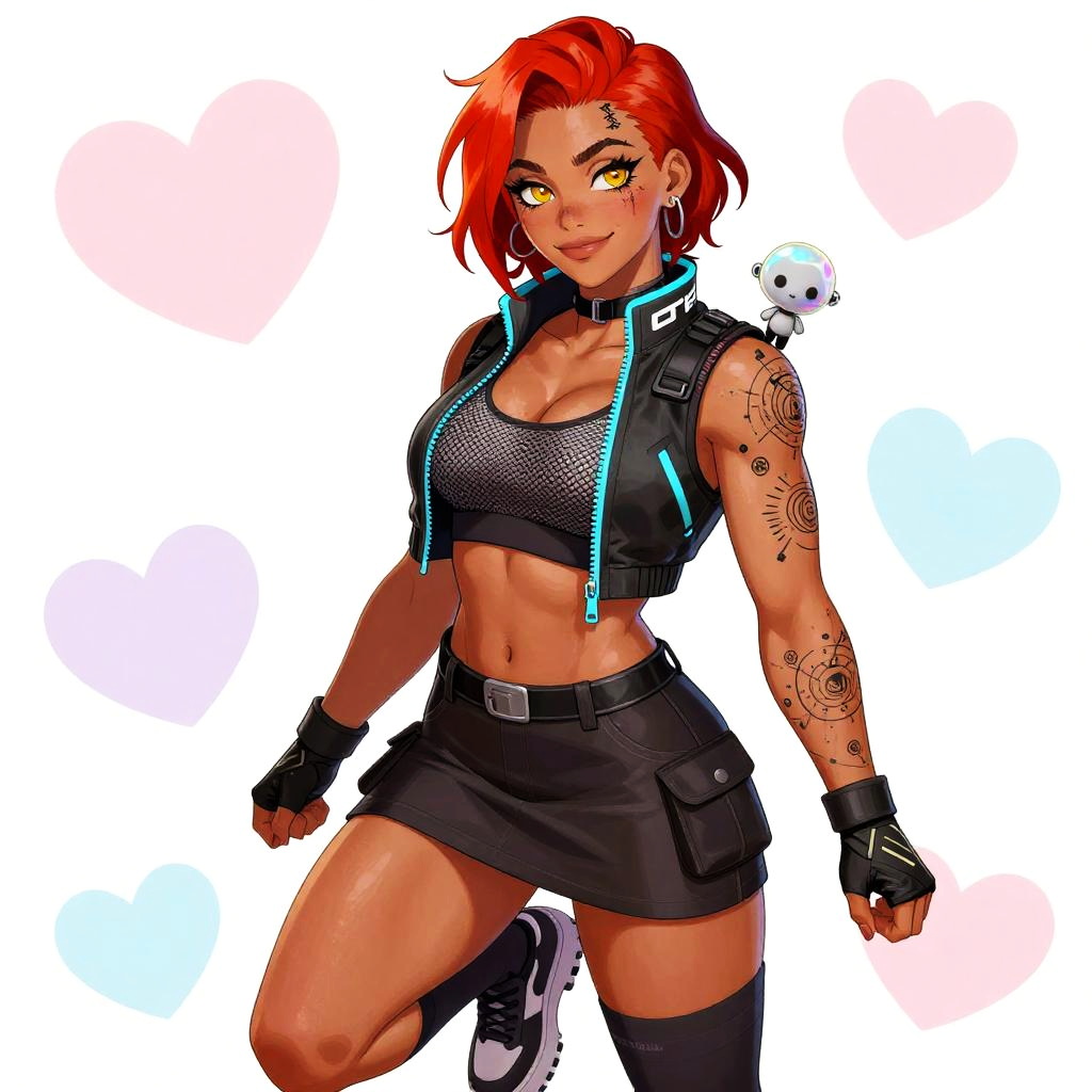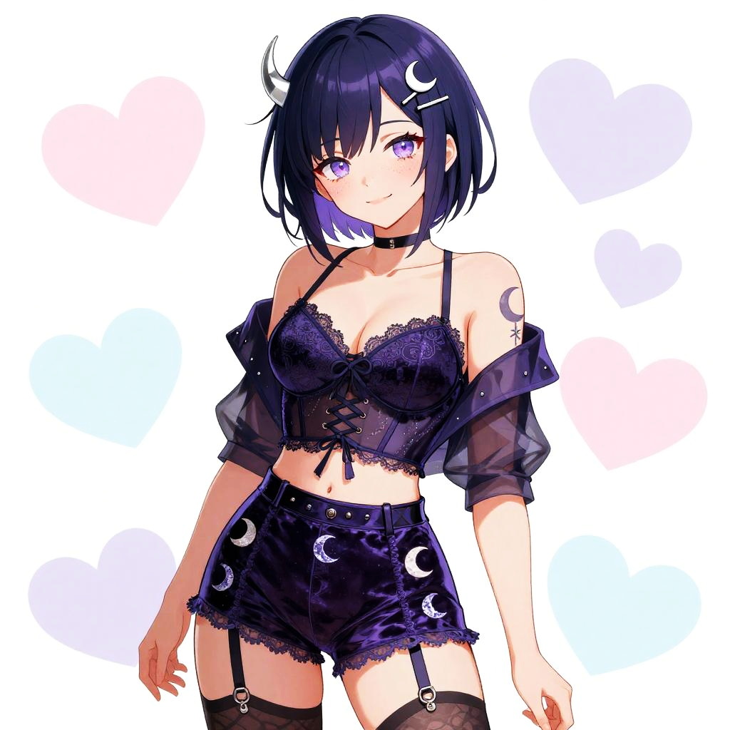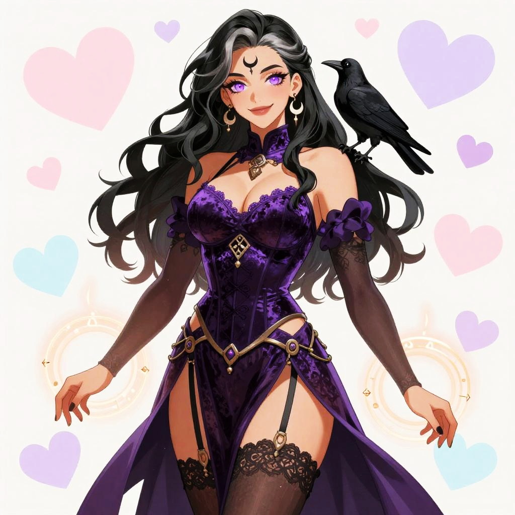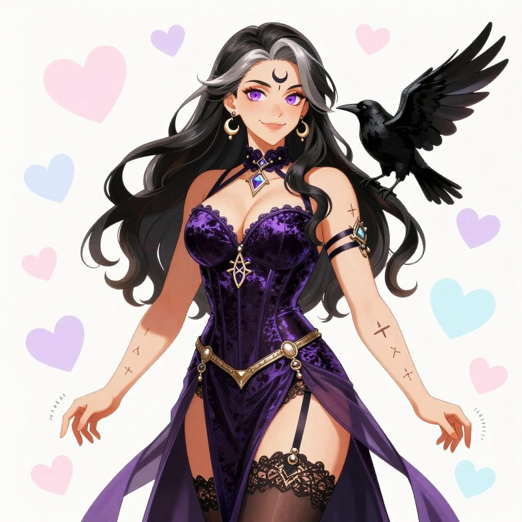 An anime style illustration of a mature sorceress with long ebony hair streaked with silver and a crescent forehead tattoo, big breasts, wearing a high-collared velvet corset top with a flowing sheer skirt featuring a thigh-high slit, thigh-high lace stockings and ornate garter belts, and floating rune sigils around her hands, a small raven perched on her shoulder, crescent moon earrings. She has smoky violet eyes and a confident, sultry half-smile. The background is decorated with pastel hearts in shades of pink, lavender, and light blue. The artwork is colorful, vibrant, featuring soft shading and smooth line art, capturing a cute, friendly, and lively atmosphere.