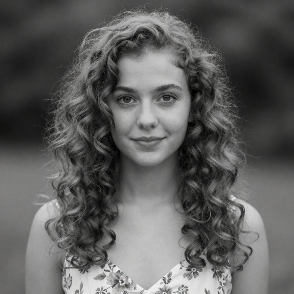 Black-and-white photograph of a young woman with voluminous, curly hair and light skin. She has large, expressive eyes and a slight smile. She wears a sleeveless, floral-patterned top. The background is blurred, focusing attention on her face and hair. Her hair frames her face, adding a soft, ured look.
