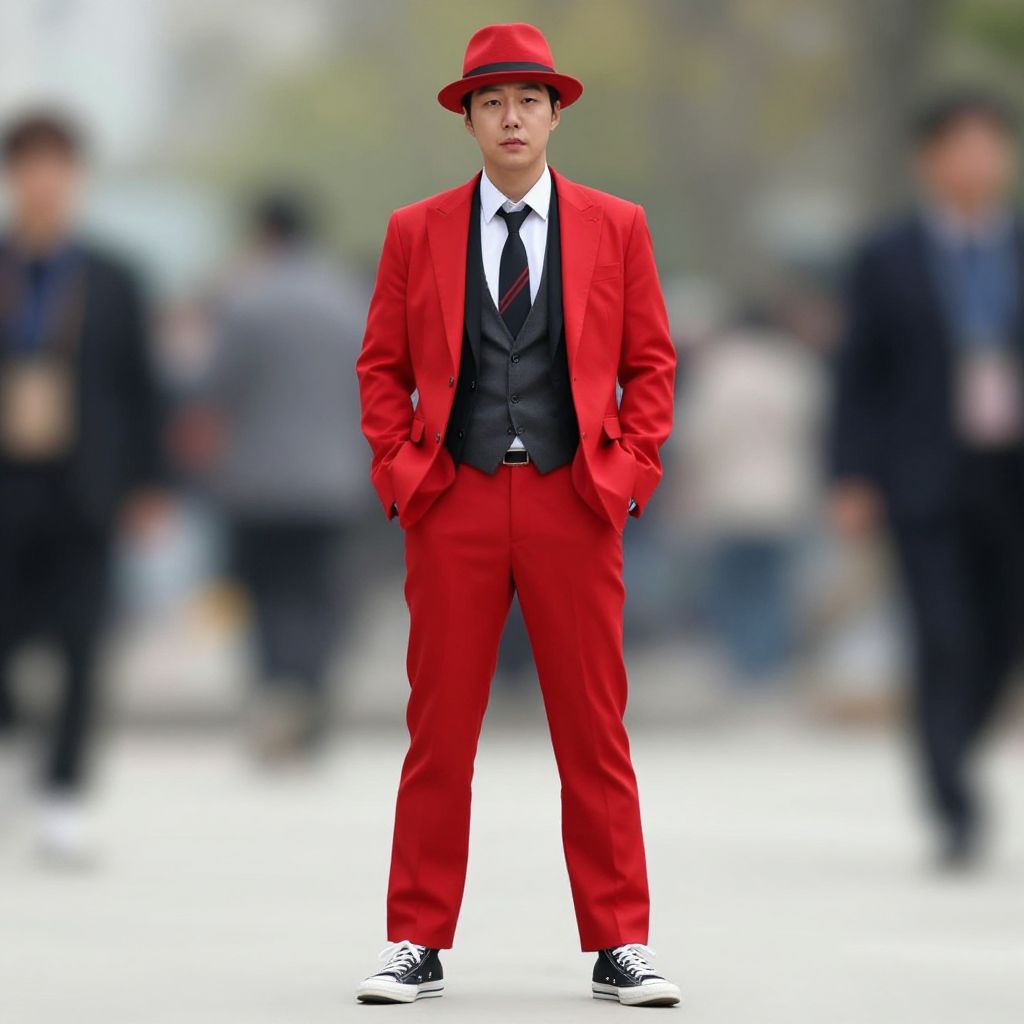Photograph of an Asian man standing confidently in a city street. He wears a bright red suit with a black vest and tie, white shirt, and black-and-white sneakers. His hands are in his pockets, and he sports a red fedora hat. The background is blurred, showing indistinct figures and greenery, emphasizing the man's striking red outfit. The image has a sharp focus on the man, with a shallow depth of field, making the background soft and out of focus. The overall style is modern and fashion-forward.