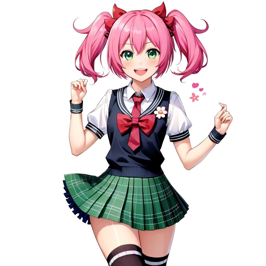 1girl, momo velia deviluke, solo, tail, thighhighs, pink hair, school uniform, smile, skirt, hair flower, open mouth, hair ornament, demon tail, zettai ryouiki, flower, sweater vest, short hair, pink eyes, black thighhighs, looking at viewer, :d, white background, bow, green skirt, simple background, pleated skirt, blush, short sleeves, shirt, plaid skirt, plaid, bowtie