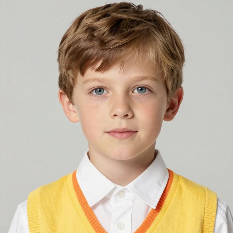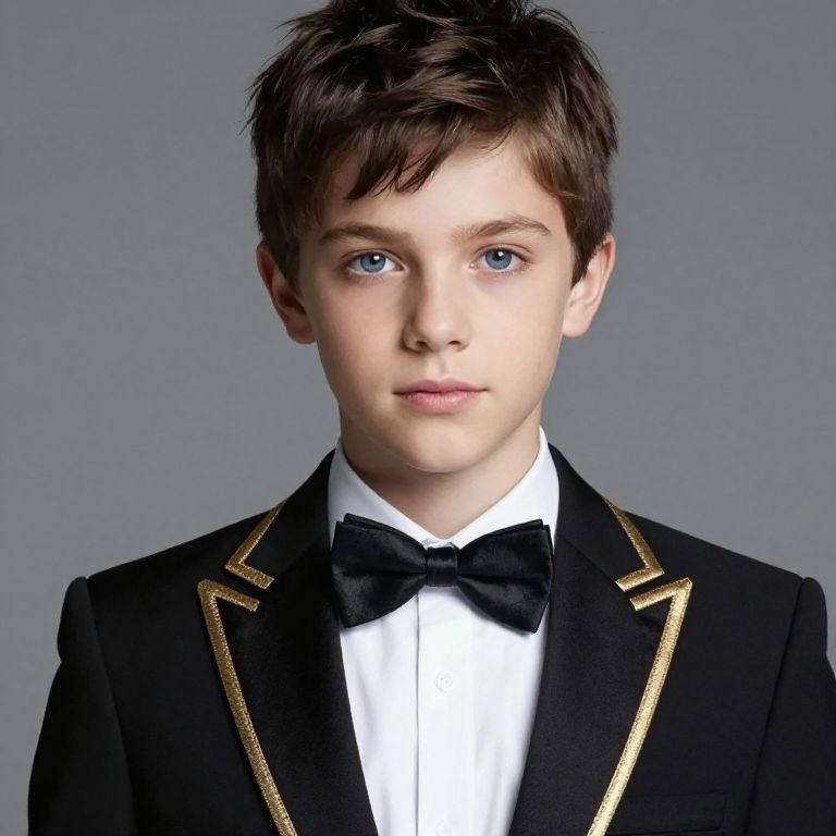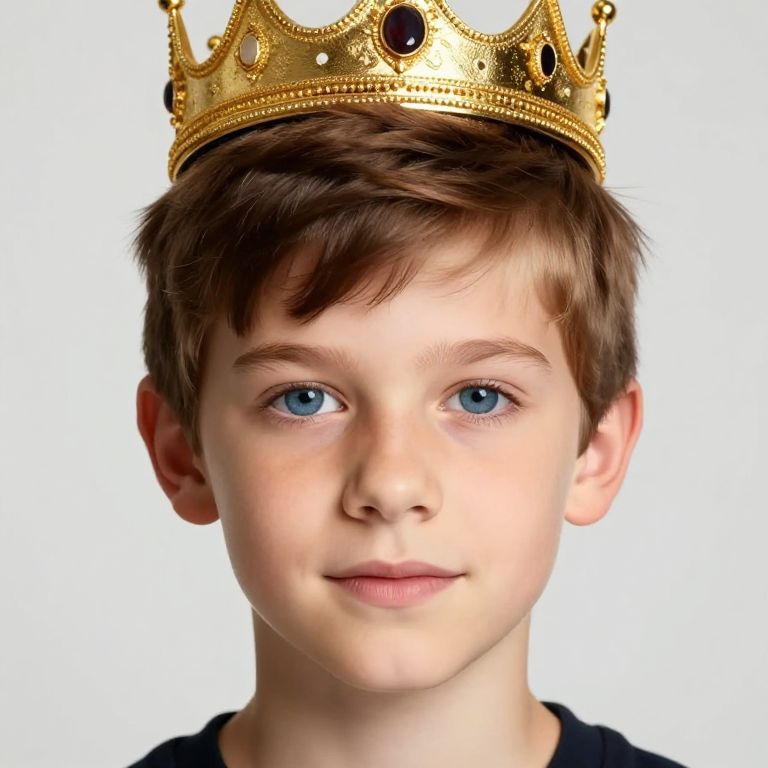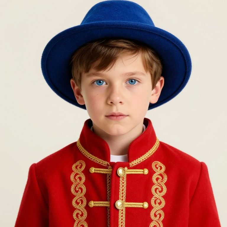Boy with brown hair and blue eyes wearing a red coat with gold embroidery and a blue hat.