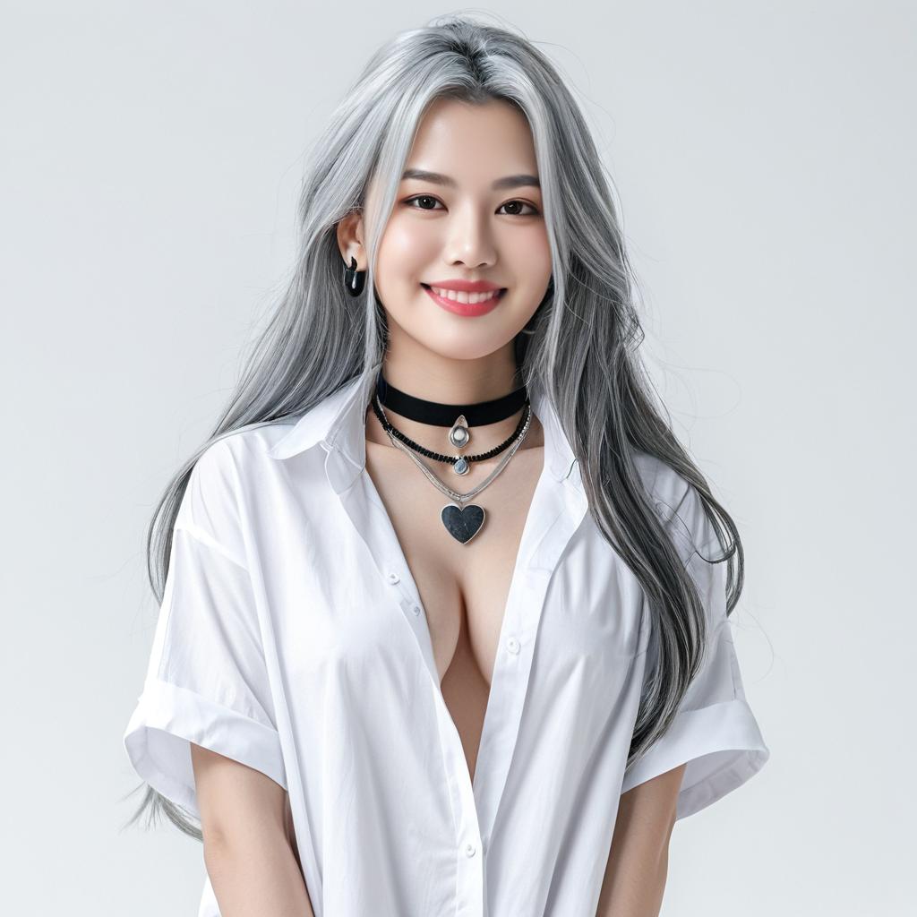 Photorealistic digital portrait of an Asian woman with long silver hair, smiling, wearing a white unbuttoned shirt, black choker, and heart