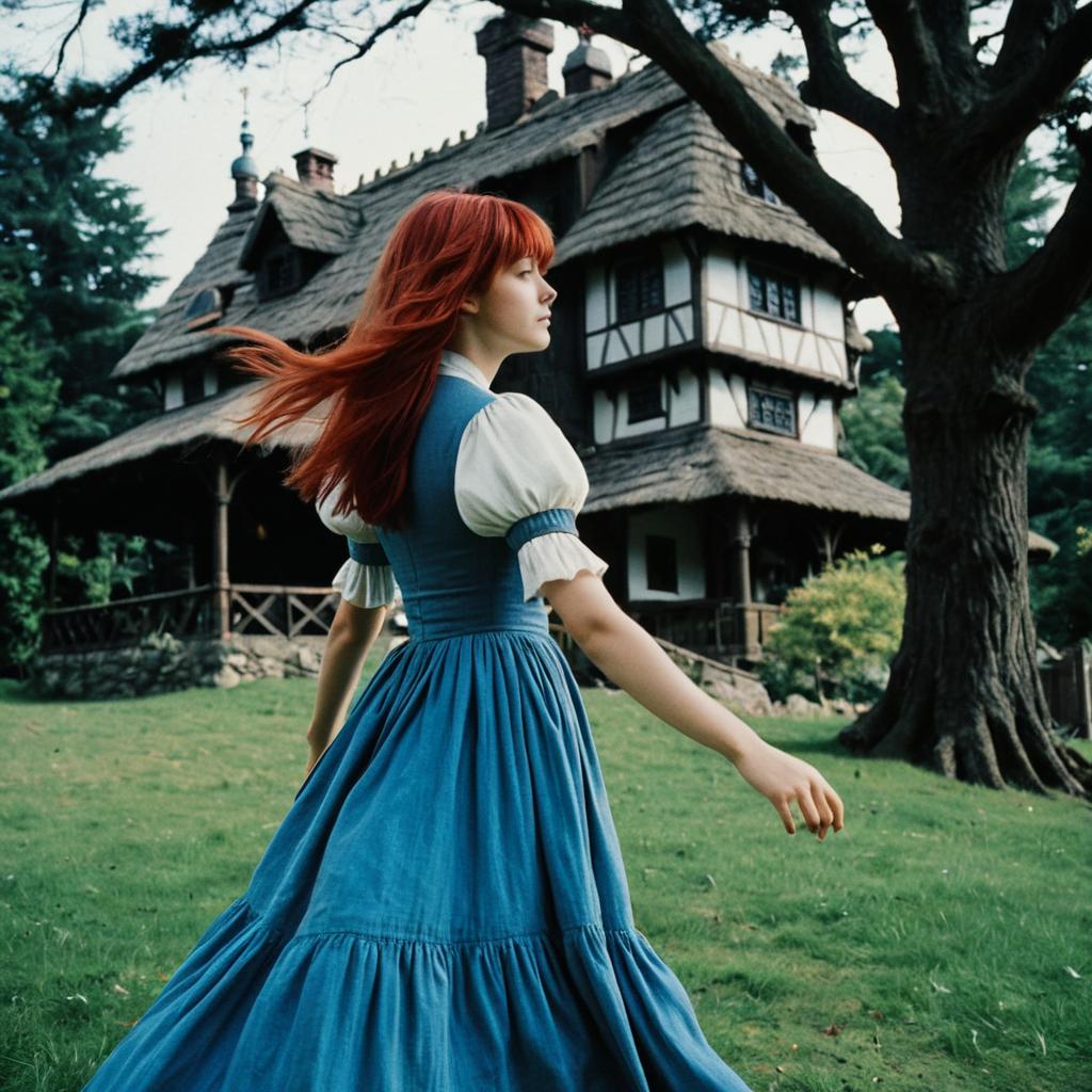 A young woman with long red hair wearing a vintage-style blue dress with puffed white sleeves stands outdoors near a traditional rustic cottage with a thatched roof and timber framing. She is positioned on a grassy area next to a large tree, facing sideways with her hair flowing in the wind. The setting has a serene, countryside atmosphere.