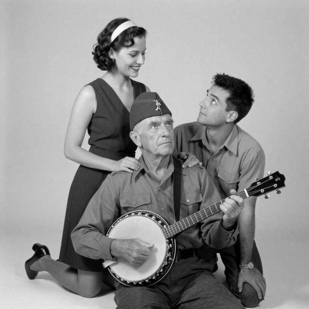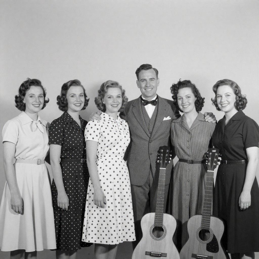 Black and white photograph of five women and one man from the 1930s-1940s era, dressed in period-appropriate dresses and a suit with a bow tie. Two acoustic guitars are positioned in front of the group. The subjects have short, styled hair and pose with cheerful expressions against a plain background.