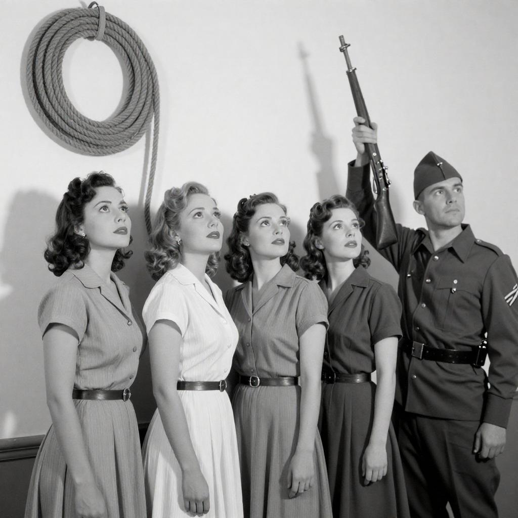 Black and white photograph of six people standing in a line, smiling. Five women, one man, 1930s-1940s fashion, short hair, polka dot dress, bow tie, holding guitar, arms around each other, cheerful expressions. Background plain.