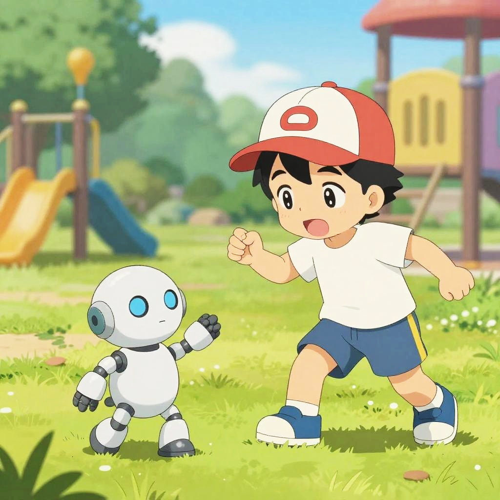Realistic photo.an energetic boy, wearing a baseball cap and shorts, interacting with a playful robot, set in a sunny playground, illustrated in the bright and whimsical manga style of Motoo Abiko. realistic photo