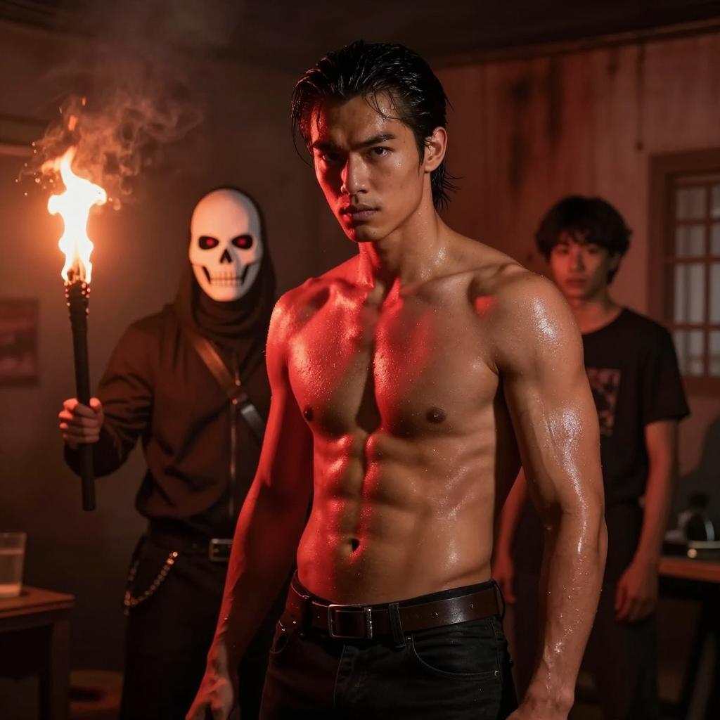 Six shirtless men with muscular builds and tanned skin stand in a grassy field at dusk. They hold wooden walking sticks and wear dark pants. The man in the center smiles widely, while the man in the foreground bends forward, head down. All men have short, messy hair. The background is a hazy sky. The man on the far right is partially obscured. The image has a warm, cinematic lighting style.