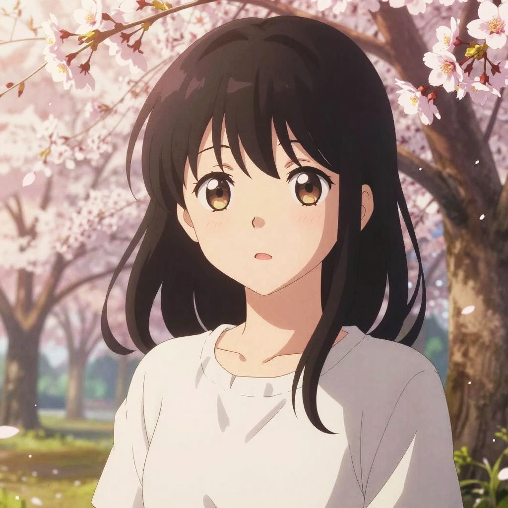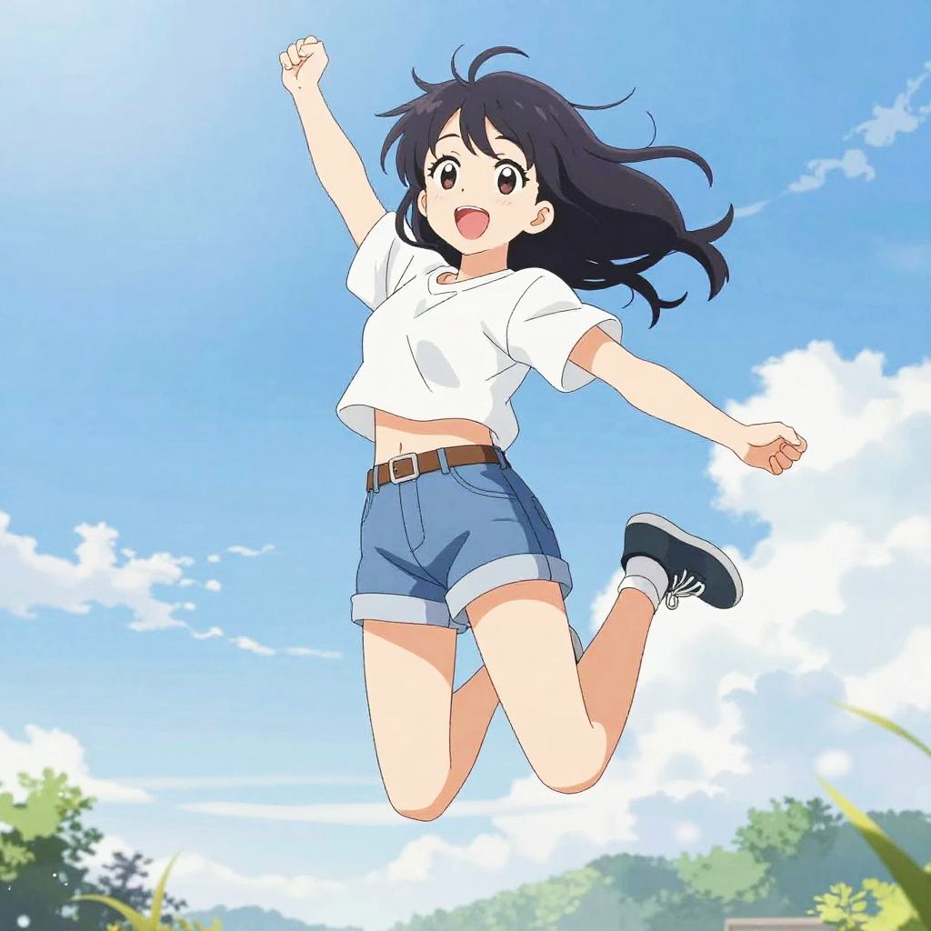 Anime girl pose, playful jumping pose with wind-swept hair and casual outfit, bright sunny day, lively expression, clean lines, anime studio quality