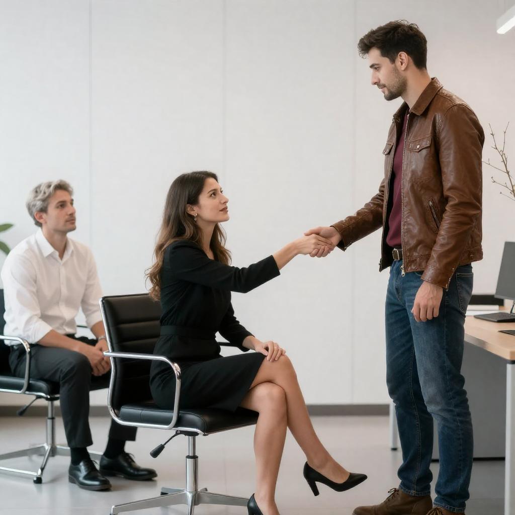 Photograph of two men in a barn. African-American man on left, laughing, wearing light blue shirt, blue jeans, short hair. Caucasian man on right, smiling, wearing green shirt, short hair, holding rope. Barn background with wooden beams and a saddle. Men shaking hands.