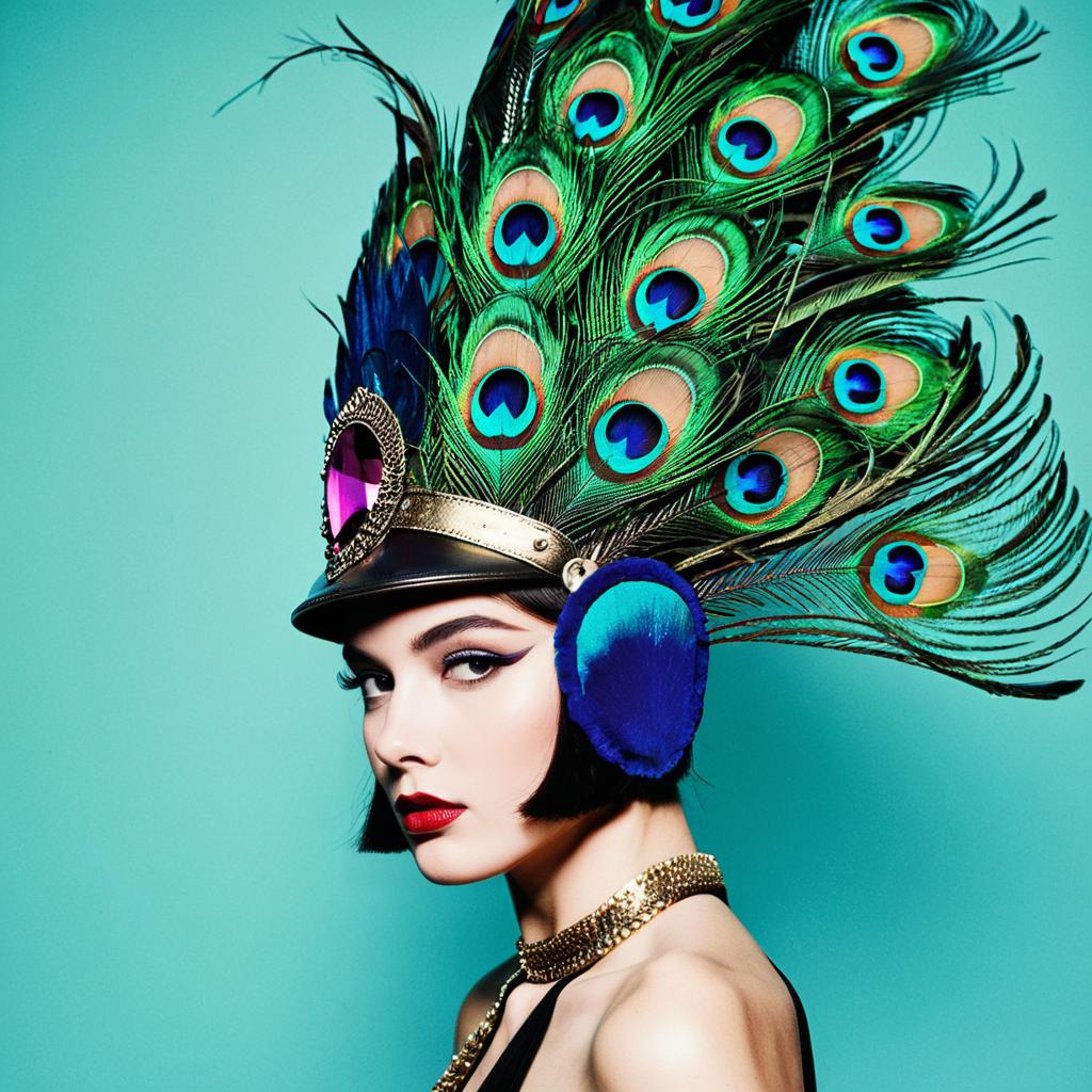 Very realistic avant-garde fashion editorial, high fashion peacock feather helm, bold surrealism with vibrant neon colors, cinematic and luxurious photography aesthetic.
