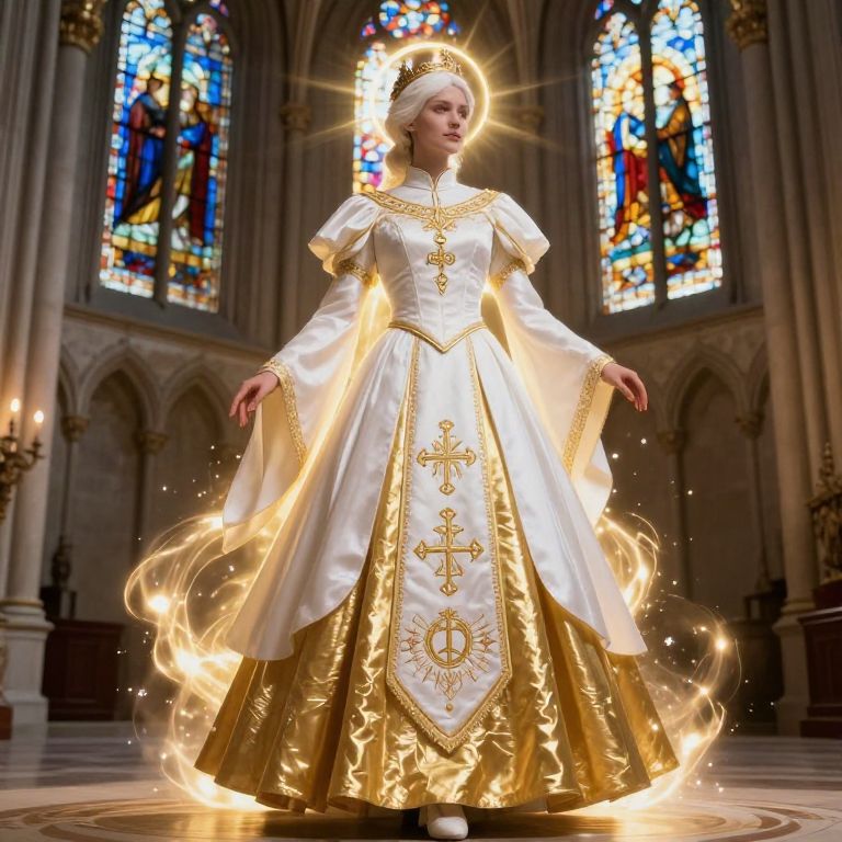 Photograph-like digital artwork of a regal, fair-skinned woman with short, white hair standing in a grand, gothic church. She wears an elaborate white and gold ecclesiastical robe with intricate gold embroidery, including a large cross and circular designs. A glowing halo hovers above her head, and ethereal golden flames swirl around her. The background features tall, arched stained glass windows depicting religious figures in vibrant colors. The stone floor and ornate candle holders add to the sacred ambiance. Her serene expression and poised stance convey a sense of divine authority and spiritual presence.