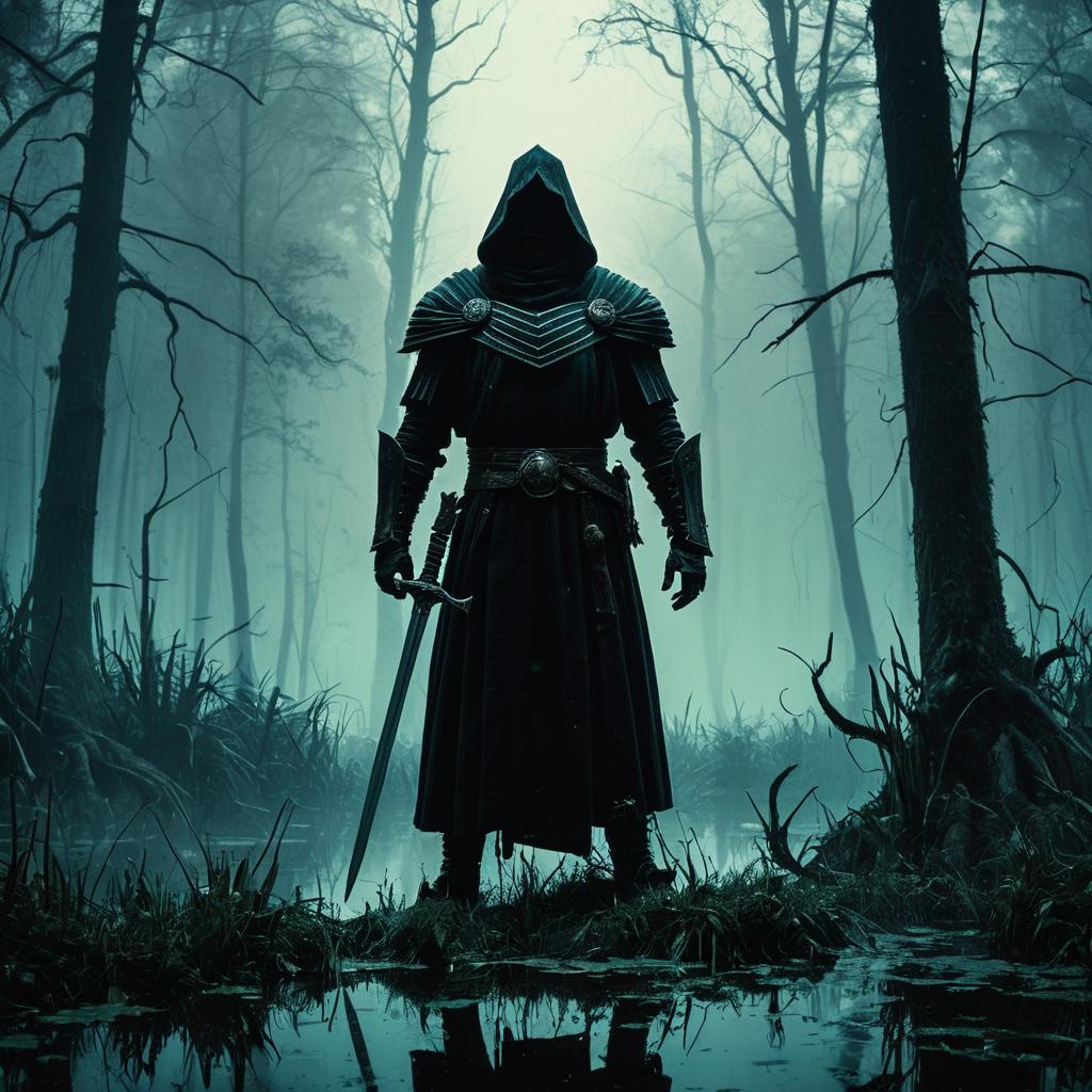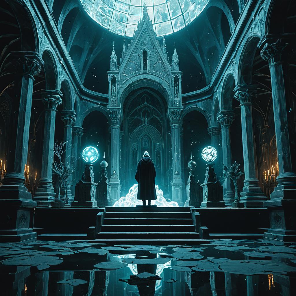 A dark, atmospheric gothic cathedral interior illuminated by ethereal blue light. A lone figure wearing a long cloak, representing an arcane elemental mage or occult crusader, stands on steps surrounded by glowing magical orbs and mystical floating elements. Ornate gothic arches and pillars frame the scene with reflections visible in a water pool with lily pads on the floor. The style is inspired by dark fantasy and mystical surrealism.